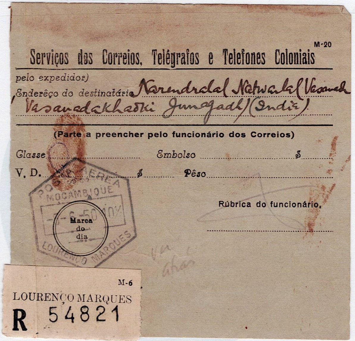 Mozambique. Fragment of a voucher sent from Lourenço Marques to India on 3 June 1950, Lourenço Marques