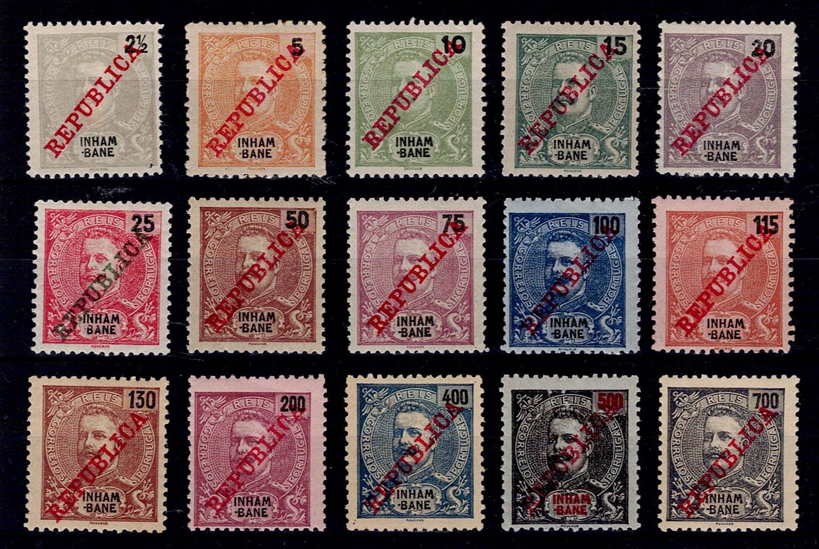 Inhambane 1911 – D. Carlos, with "Republic" overprint. Complete series MF#32-46, perforation 11 3/4.