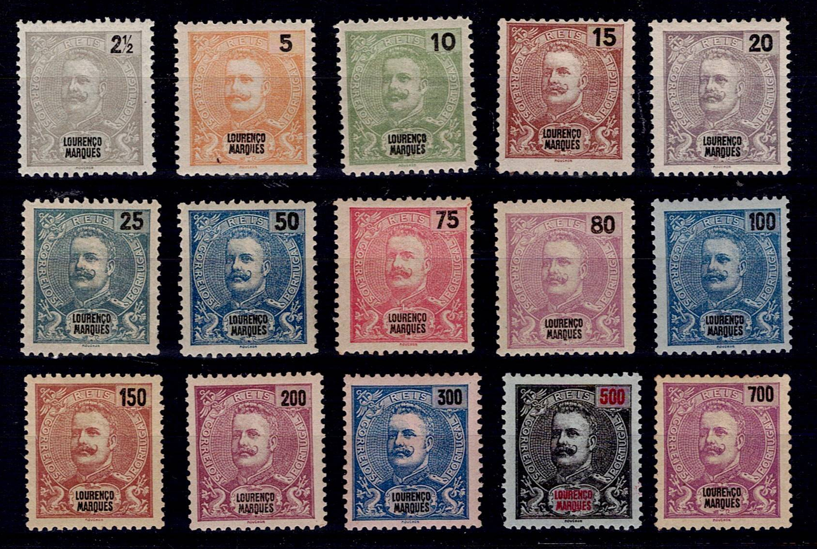 Lourenço Marques 1893-94 D. Carlos I Mouchon. Complete series of Mf#32-46, smooth to lightly dotted