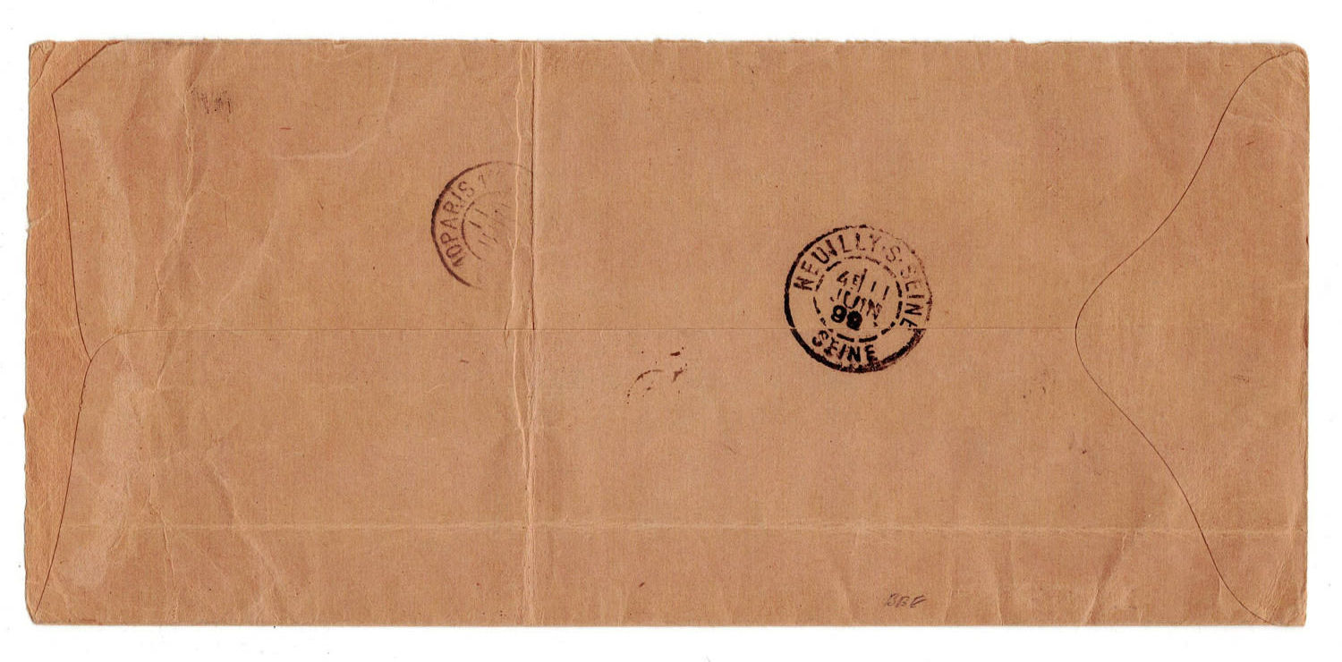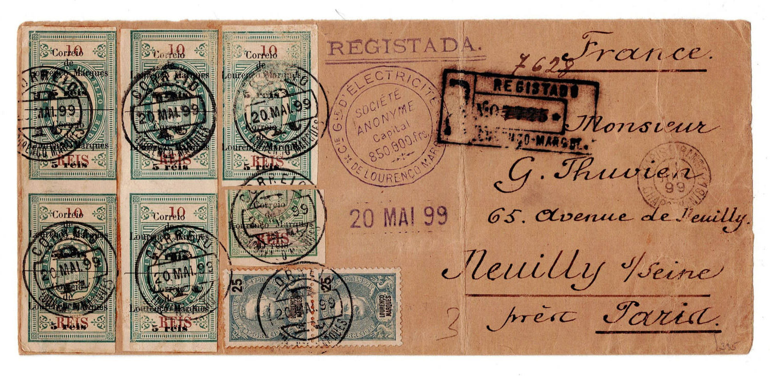 Lourenço Marques to France on 20.5.1899, franked with 200 reis, using 2 complete pairs and one stamp of 5/10 reis MF 53, lower half of 50/30 reis, and a pair of 25 reis Mouchon. Arrived in Paris on 11.6. Rare.(Image 1)