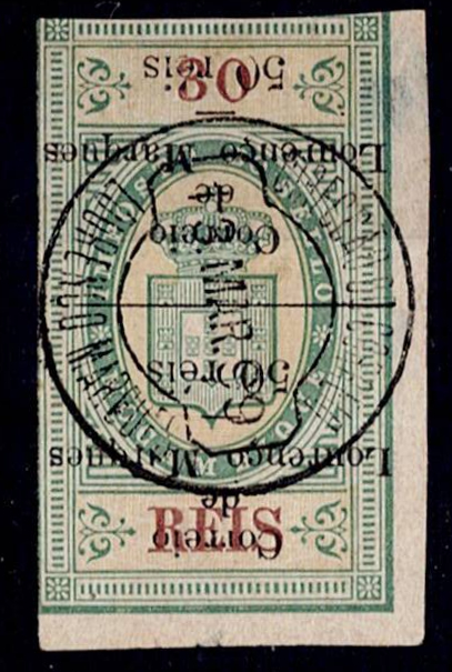 2.5 reis brown, smooth paper, 11 3/4 notch with ERROR INVERTED overprint. Stamped stamp, with good color. Stamp cataloged but with no assigned value.(Image 1)