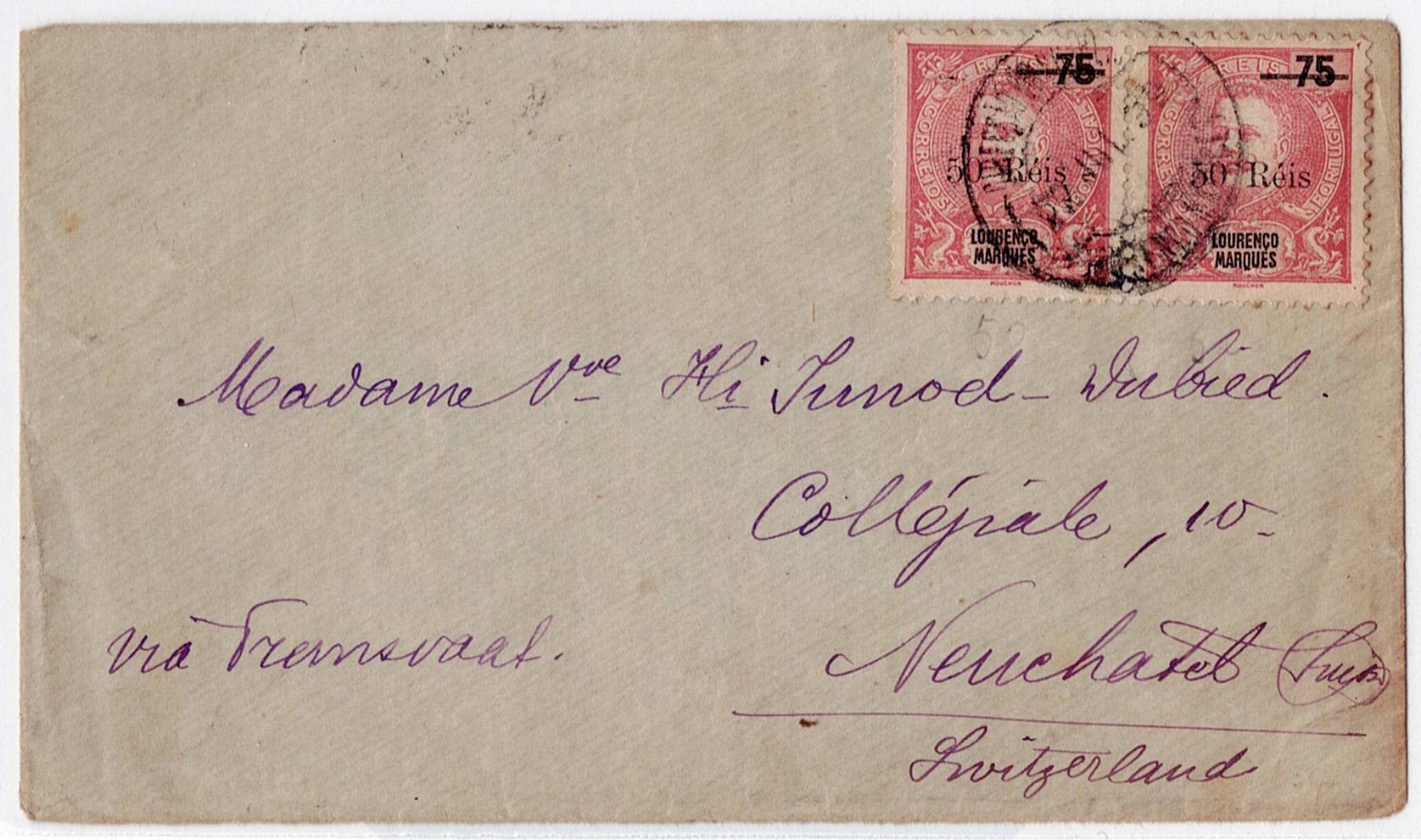 stamps of Lourenço Marques of 75 Reis with surcharge of 50 Reis, to Neuchâtel in Switzerland where it arrived on August 12(Image 1)