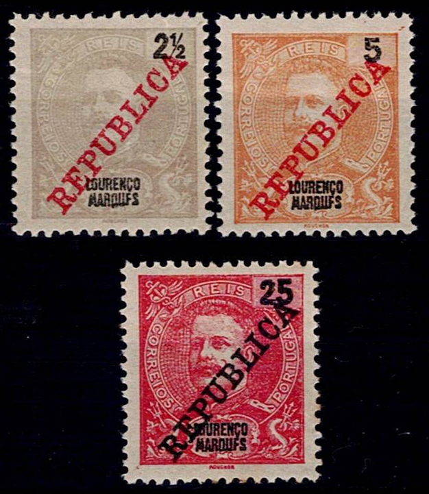 Lourenço Marques 1911 D. Carlos with Republic overprint. 3 stamps WITH VARIETY "MARQUFS with F" Mf#78b,
