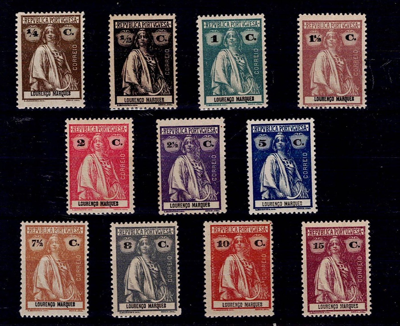 Lourenço Marques 1918-21 Ceres. Complete series of stamps on PLAIN PAPER Mf#117-127 in perforation 15,