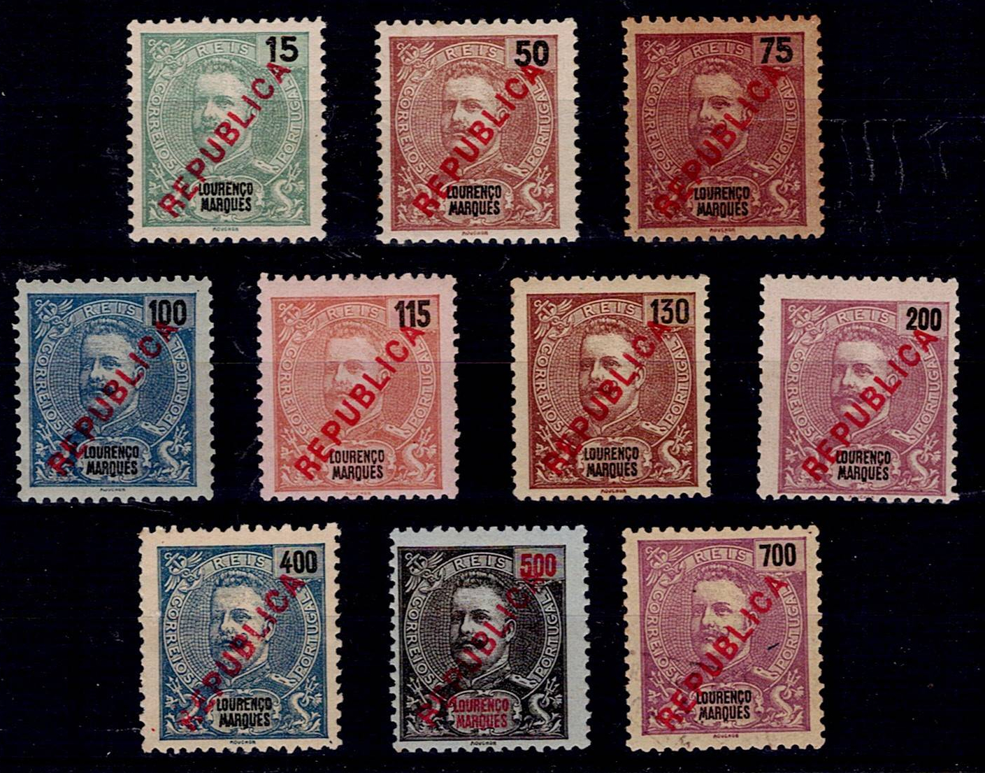 Lourenço Marques 1917 D. Carlos I, with local "REPUBLICA" overprint. Complete series of Mf#147-156,