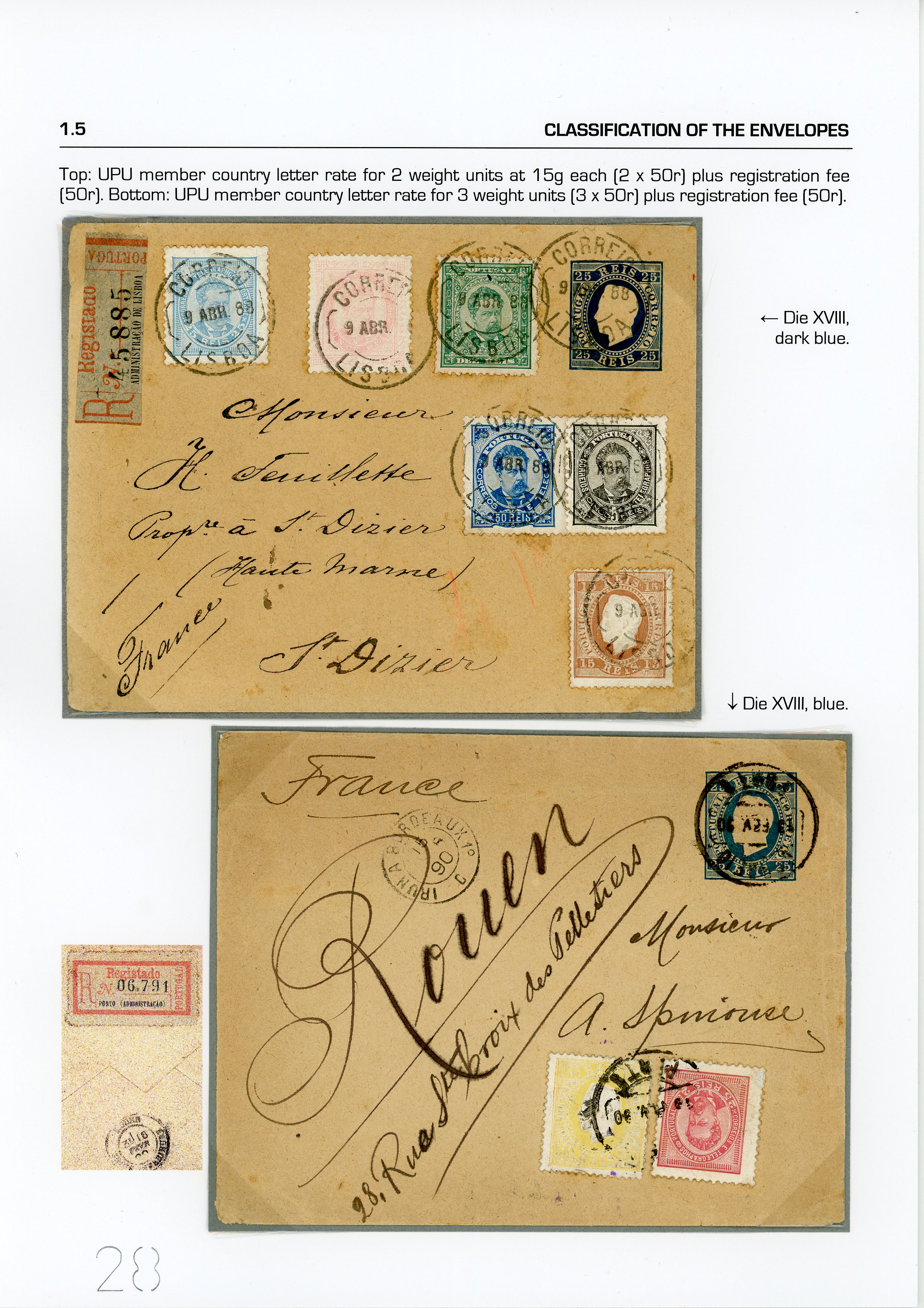 registered envelopes with additional items for France, one with a 150 reis seal. D. Luis, relief, MR MB(Image