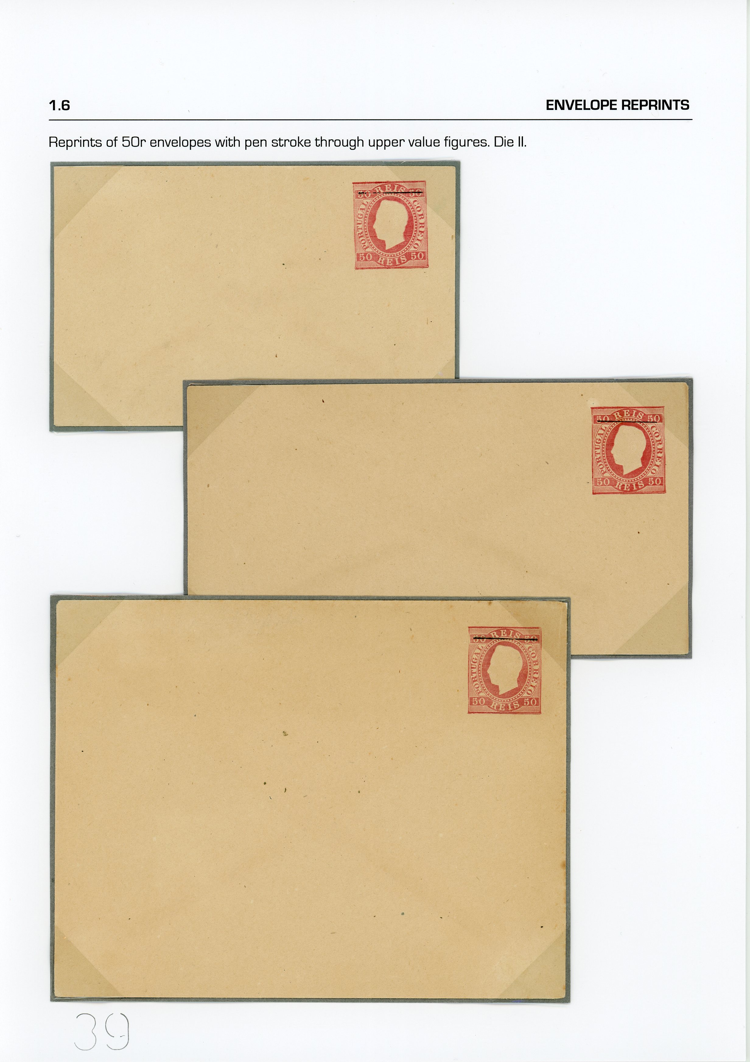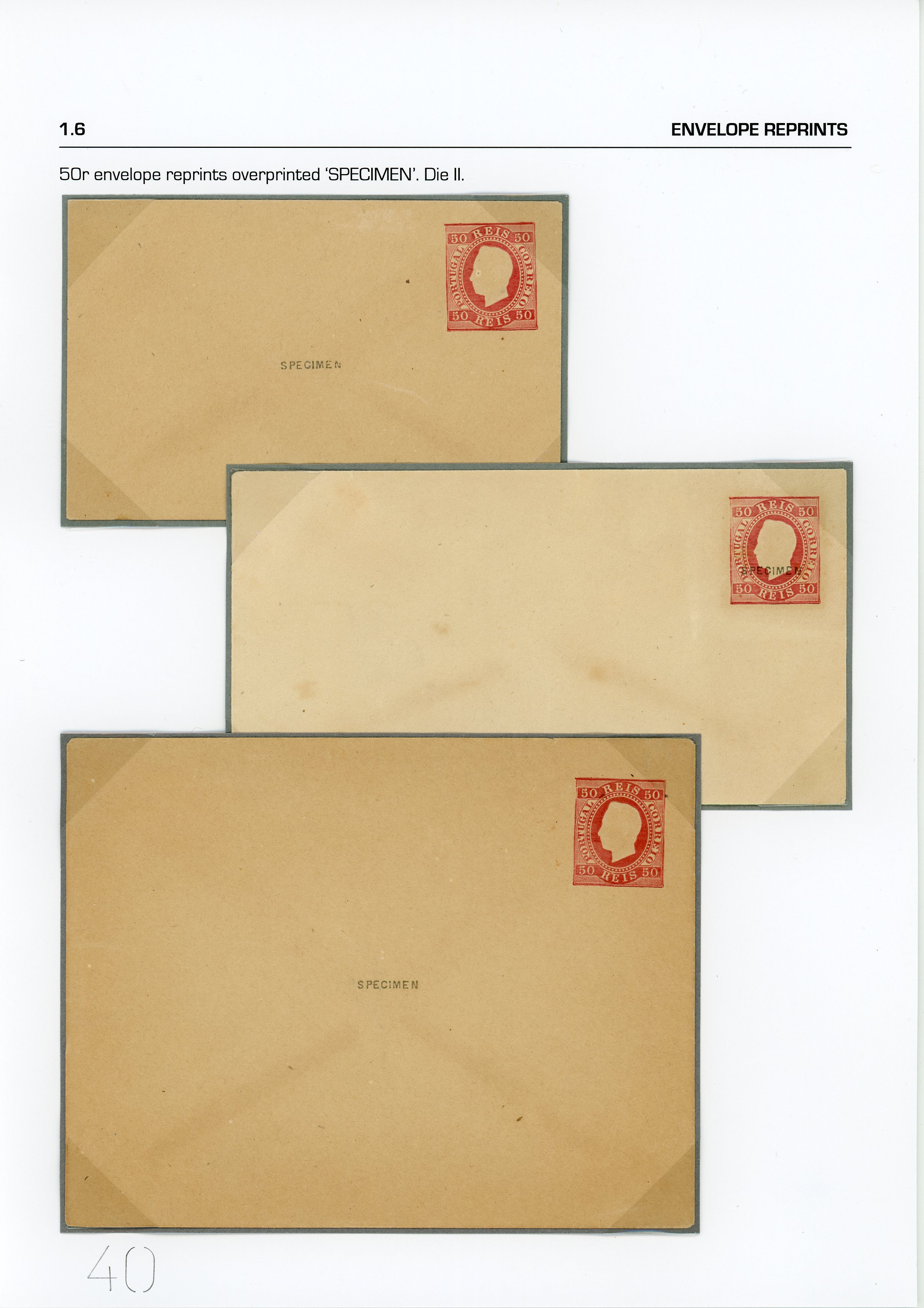 6 envelopes in 3 sizes of 50 reis pink, with line and Specimen.(Image 1)