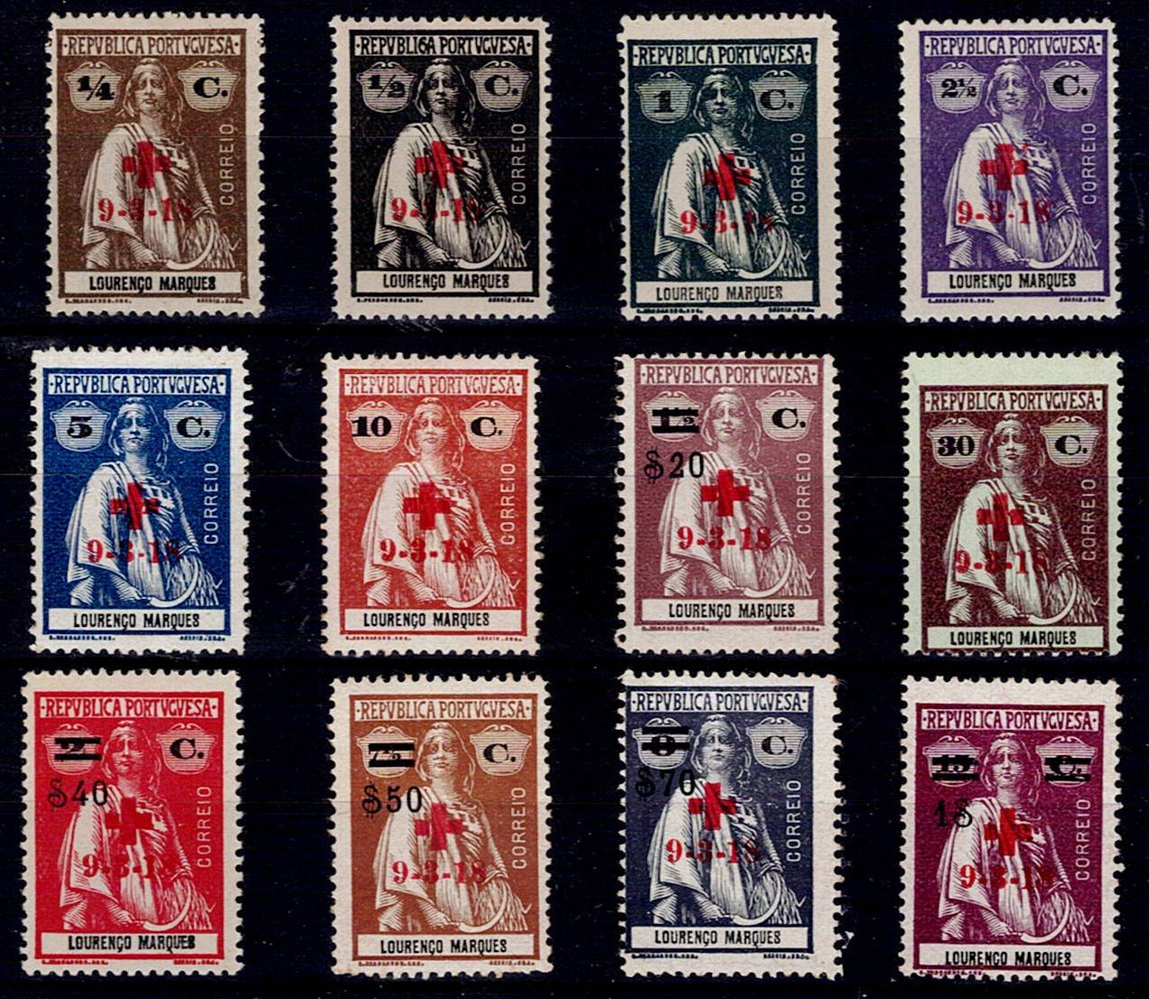 795 imageLourenço Marques 1918 Ceres with "Red Cross" overprint and surcharge. Complete series of stamps Mf#159-170, in new stamps, with gum and hinge mark except Mf#171 without gum. Catalogue value €82 .(Image 1)