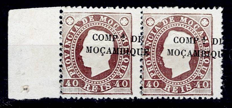 798 imageMozambique Company 1892 D. Luís I, right-hand strip. Stamps of Mozambique with the "COMP.ª DE MOÇAMBIQUE" overprint. PAIR of Mf#5 sheet edge, 40 reis red-brown, overprint A, on porcelain paper and 12 3/4 perforation with an overprint ERROR VERY DISPLACED to the right. New stamps, ungummed, with good color and relief, without defects or repairs. Good.(Image 1)