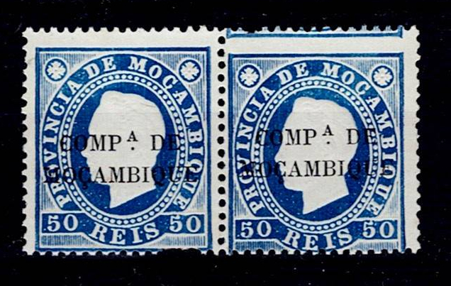 799 imageMozambique Company 1892 D. Luís I, right ribbon. Stamps of Mozambique with overprint “COMP.ª DE MOÇAMBIQUE”. PAIR of Mf#6, 50 reis dark blue, overprint B, in porcelain paperand 13.5 indentation with a PRINTING ERROR on the right stamp, very OFFSET downwards. New stamps, without gum, with good color and relief, with a flaw in the indentation on the left stamp, without repairs. Good.(Image 1)