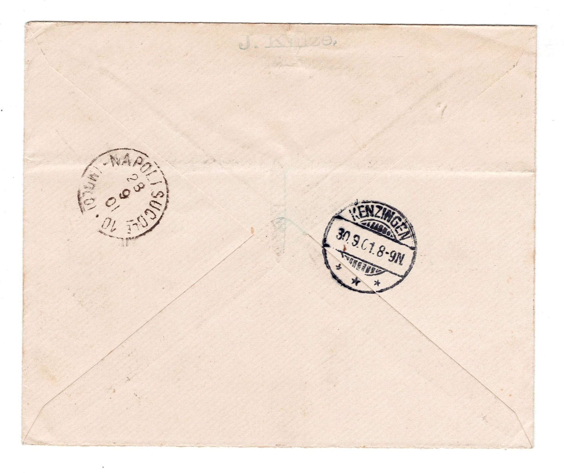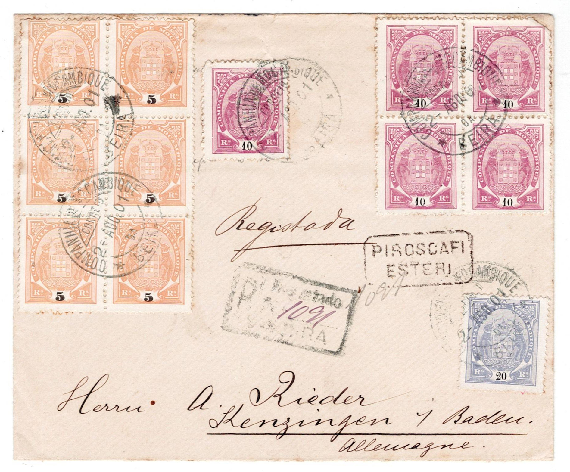800 imageCª de Moçambique. Letter registered in Beira on 2 August 1901, to Germany, postage of 100 reis (Elephant stamps; block of 6 of 5 reis, block of 4 of 10 reis, one stamp of 10 and one of 20 reis), by packet to Naples 28 September, marked PIROSCAFI ESTERI, and from there forwarded to Kensingen, where it arrived on 30 October 1901. Very beautiful letter, rare postage.(Image 1) (Image 2)