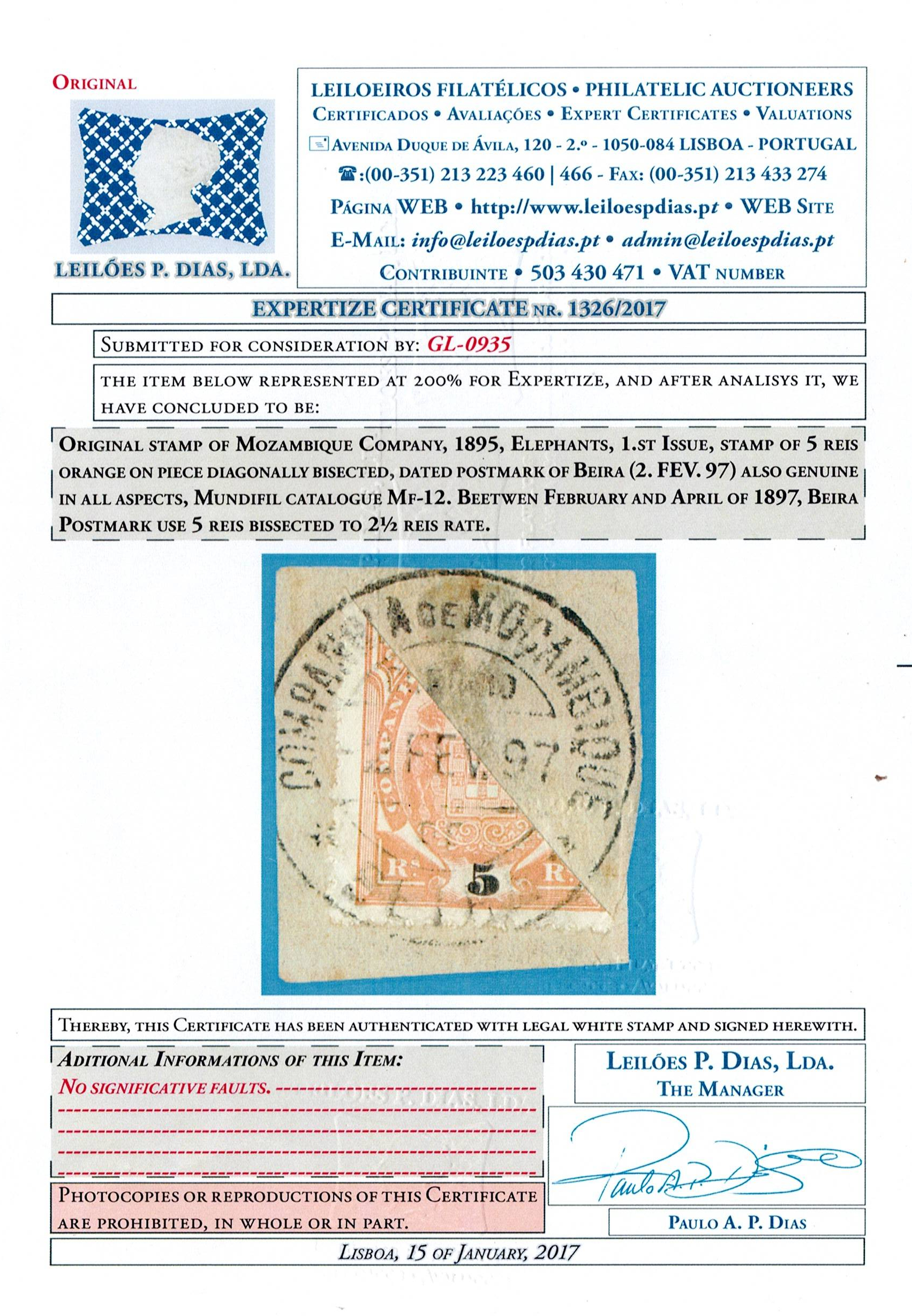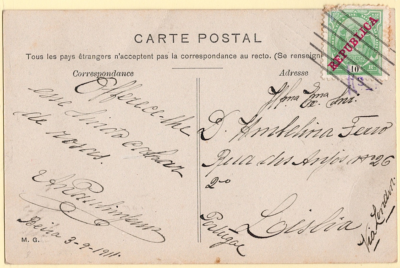 807 imageCompanhia de Moçambique * 1911 – Elephants, with the “REPUBLICA” overprint from Lisbon. Illustrated postcard sent from Beira (03.09.11) to Lisbon, with stamp of 10 réis, green, chalky paper, perforation 11 ¾, MF79, to pay the rate of a simple postcard to Portugal. Stamp without damages and repairs, with good colour, obliterated with a mute bar postmark, applied in Lisbon.(Image 1)