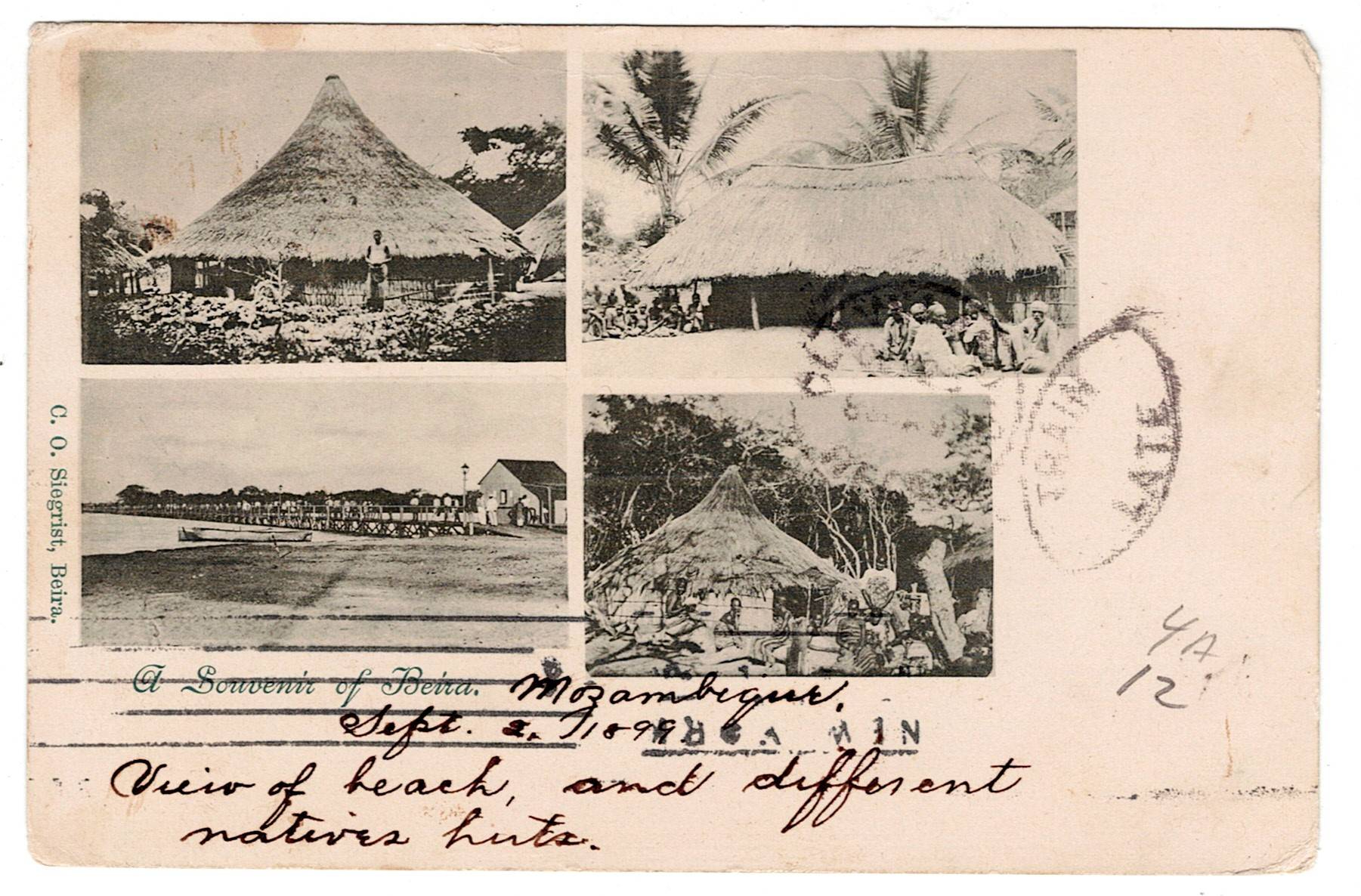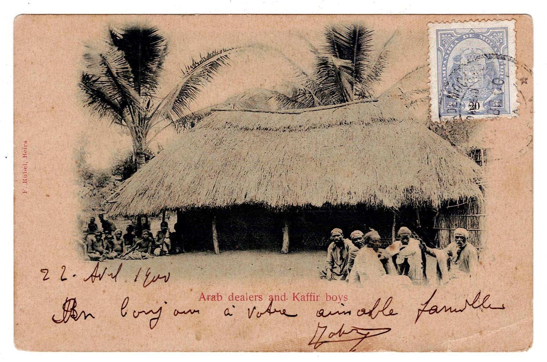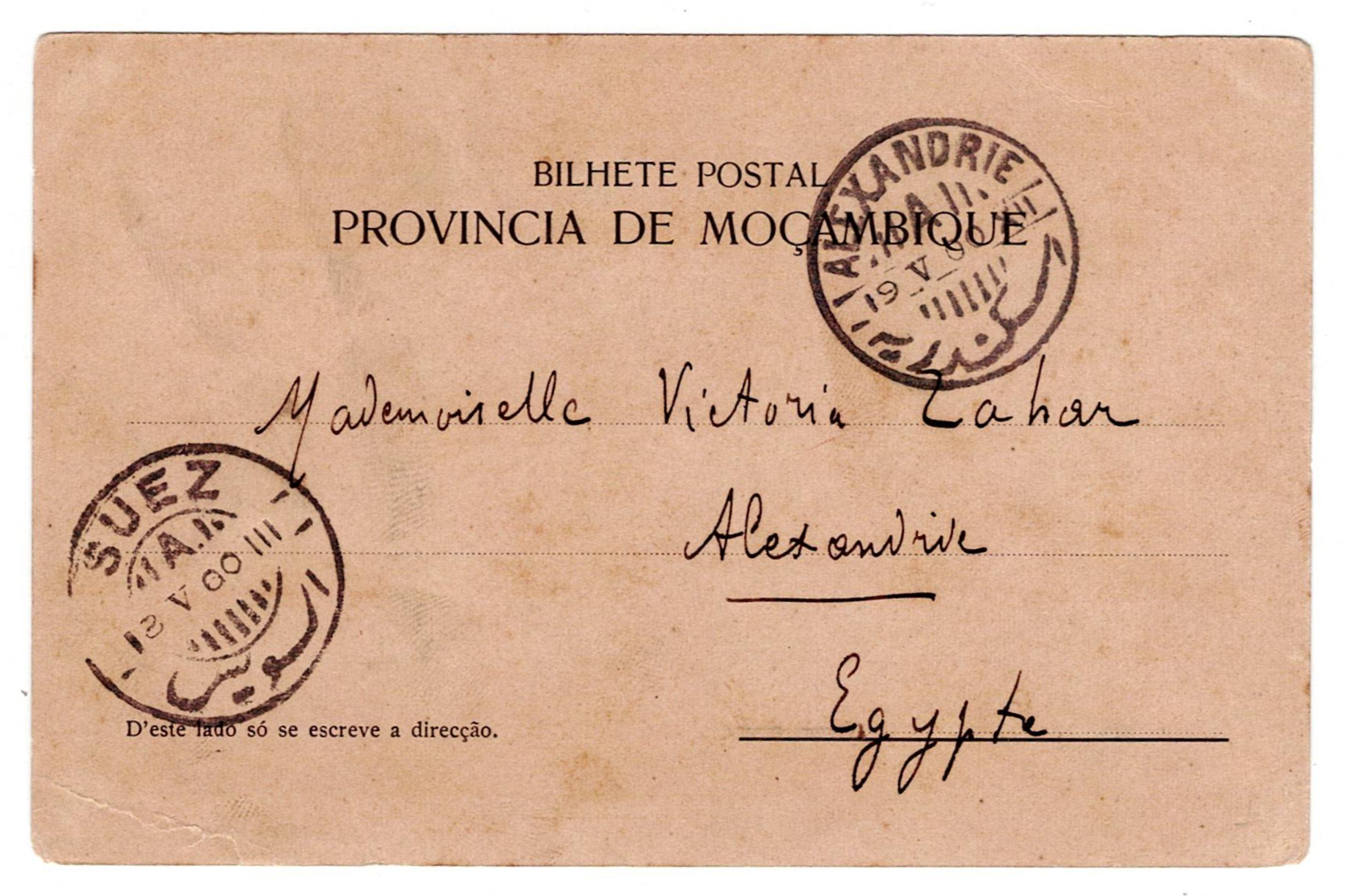 803 imageMozambique Company. Illustrated postcard, sent from Beira on April 22, 1900, to Alexandria, Egypt, 20-cent postage, with the Elephants stamp. Transit marks in Suez at 18.5 and Alexandria at 19.5, €25(Image 1) (Image 2)