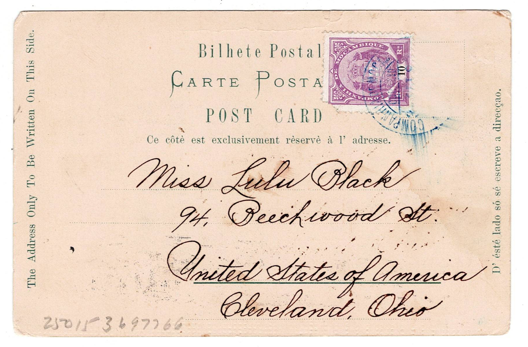 802 imageMozambique Company. Illustrated postcard, sent from Beira on September 2, 1899, to Cleveland, USA, 20-cent postage, with a 10-cent Elephants stamp, another missing, an Arrival in Cleveland mark, and also a TRAIN LATE. Interesting.(Image 1) (Image 2)