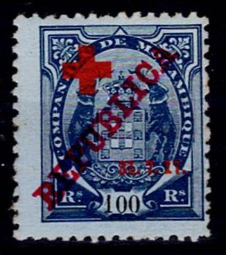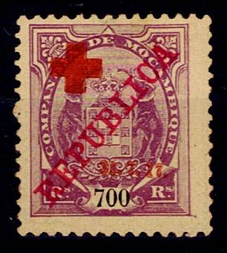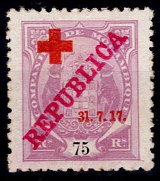 810 imageMozambique Company 1917 Elephants with "Republic" and Red Cross overprint. Stamp Mf#113, colored porcelain paper, ungummed and oxide. Catalogue Value €320.(Image 1)