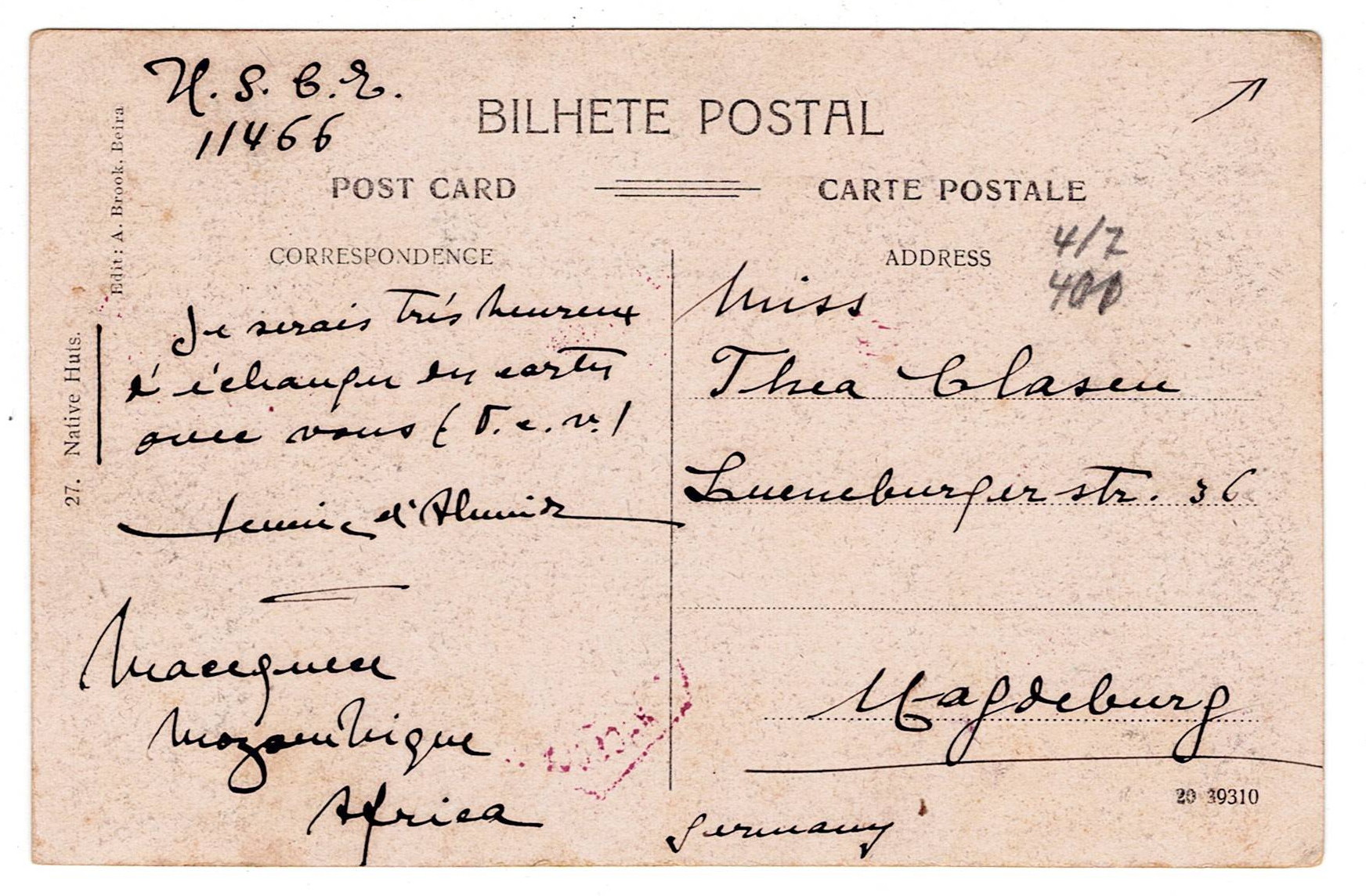 811 imageCª de Moçambique. Illustrated postcard, sent from Macequesse on June 10, 1923, to Magdeburg, 3 centavos postage, unused stamps with Macequesse date stamp in red(Image 1) (Image 2)
