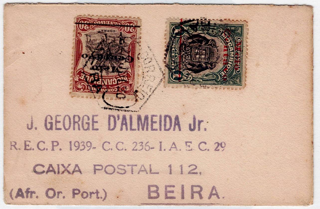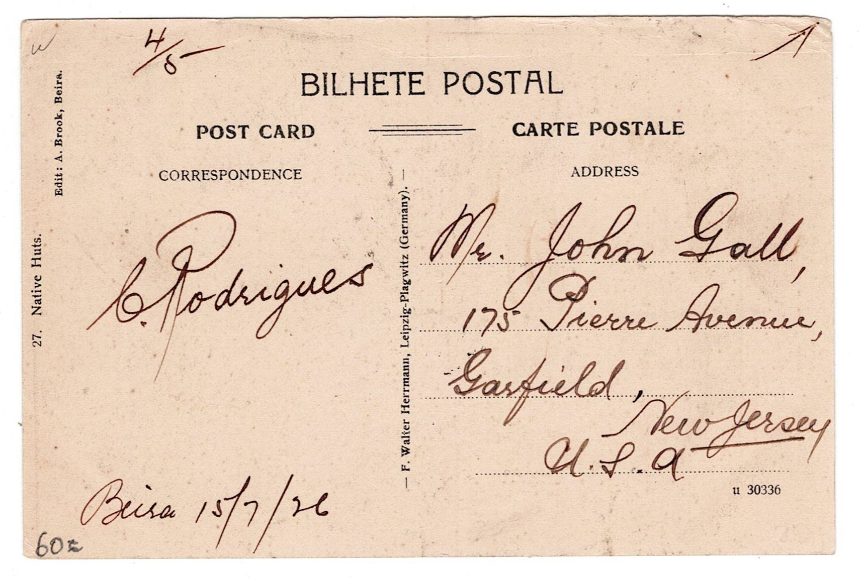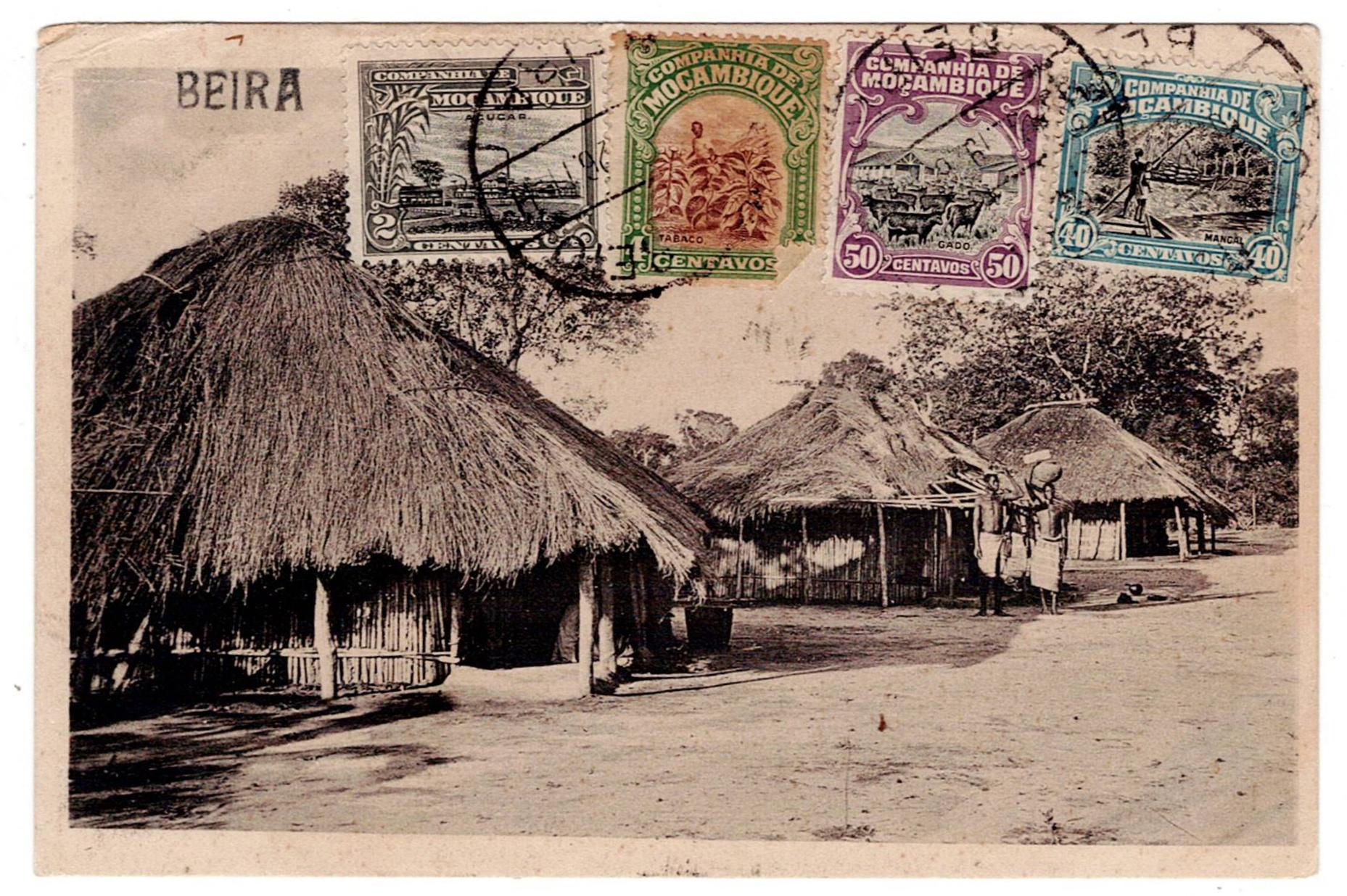 814 imageCª de Moçambique. Illustrated postcard, sent from Beira on July 15, 1926, to New Jersey, 96-cent postage, with 50-, 40-, 2-, and 4-cent stamps. Local motifs.(Image 1) (Image 2)
