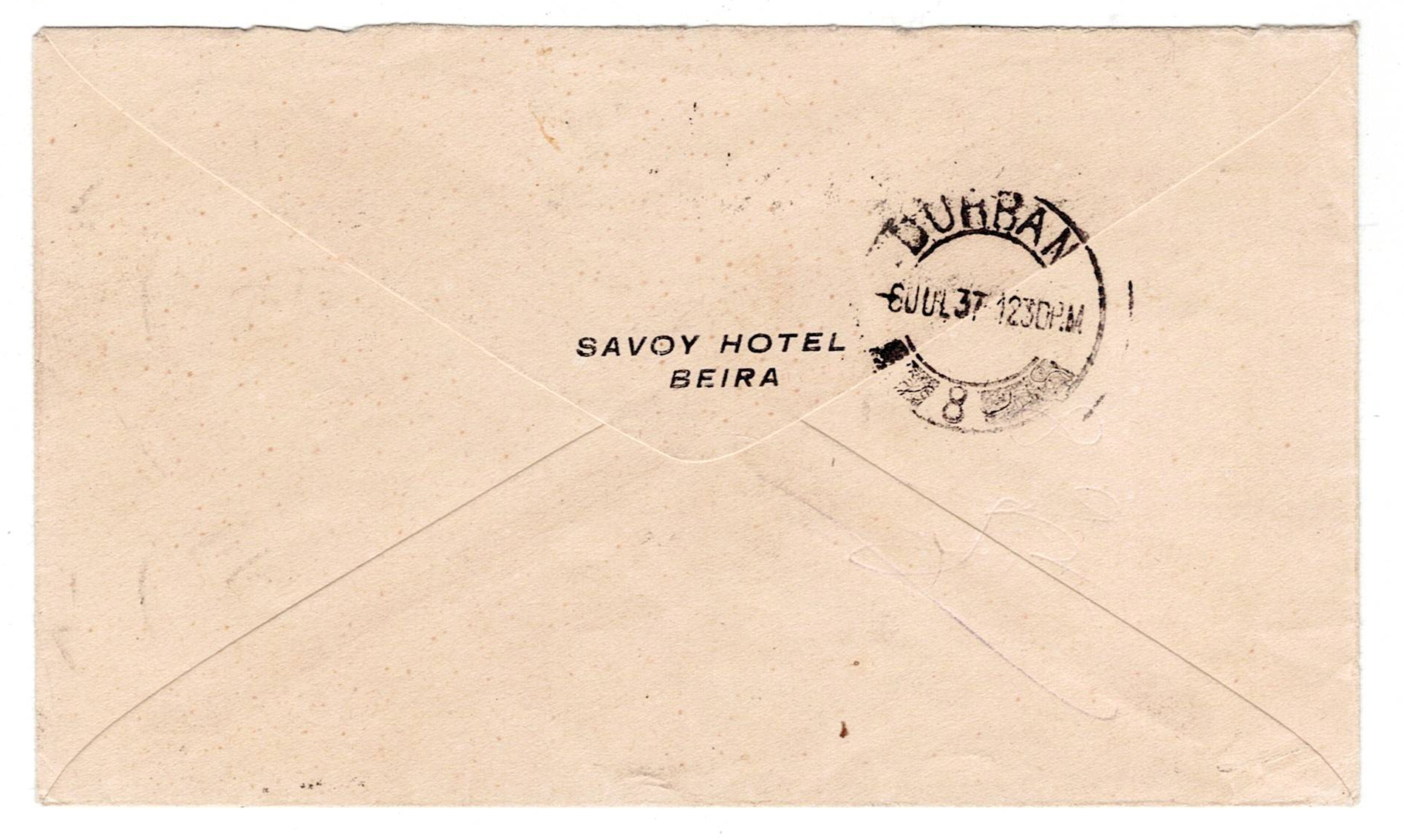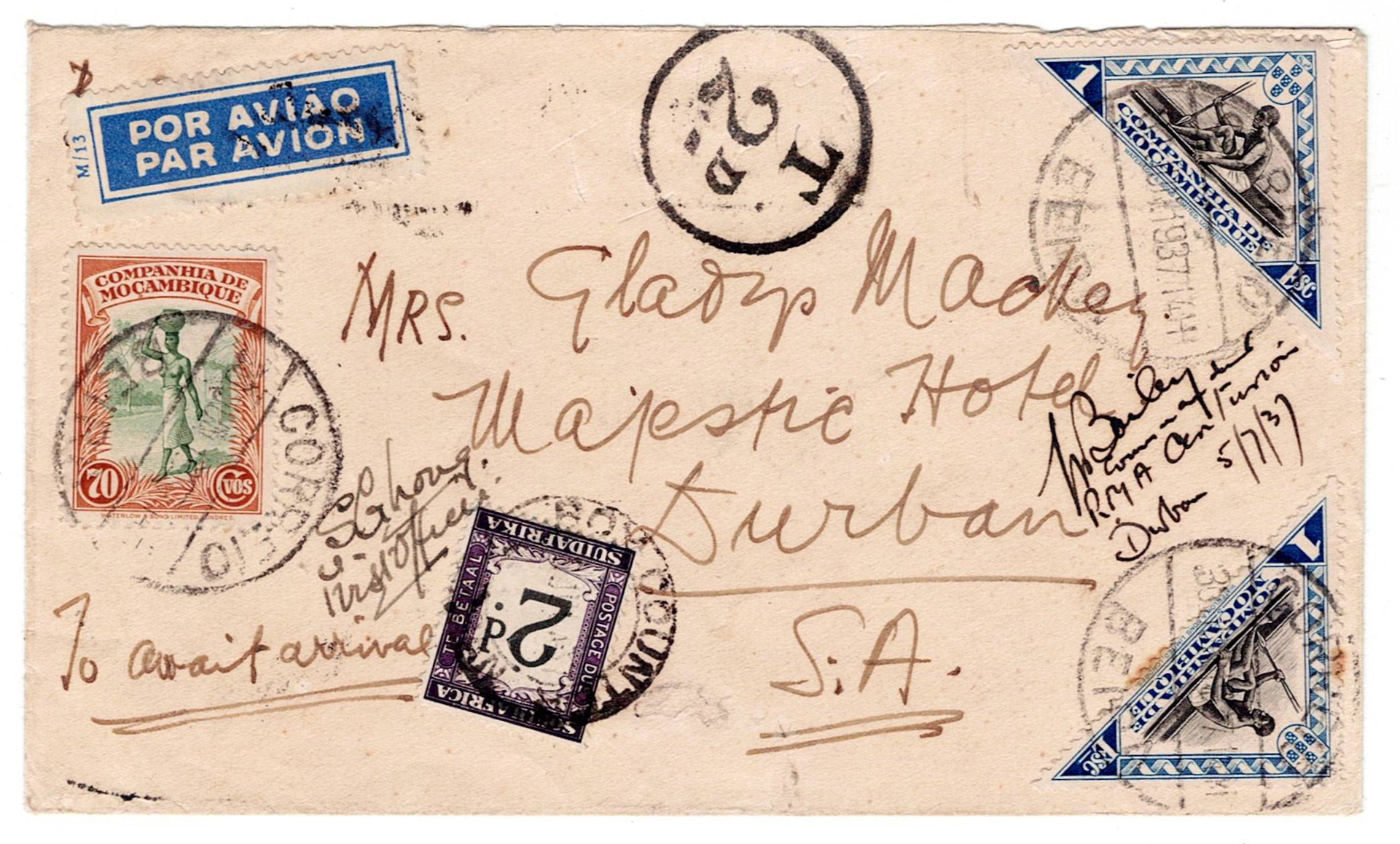 815 imageMozambique Company. Letter sent from Beira on 6/30/1937, by airmail, postage of 2$70, with 1$00 (2) and 70 cent stamps. The letter was sent to Durban by airmail, signed by the commander of the RMA CENTURION, and by the 1st officer, arriving on 7/5. In Durban, a fine of 2d was applied, paid by postage stamp. MB and R.(Image 1) (Image 2)
