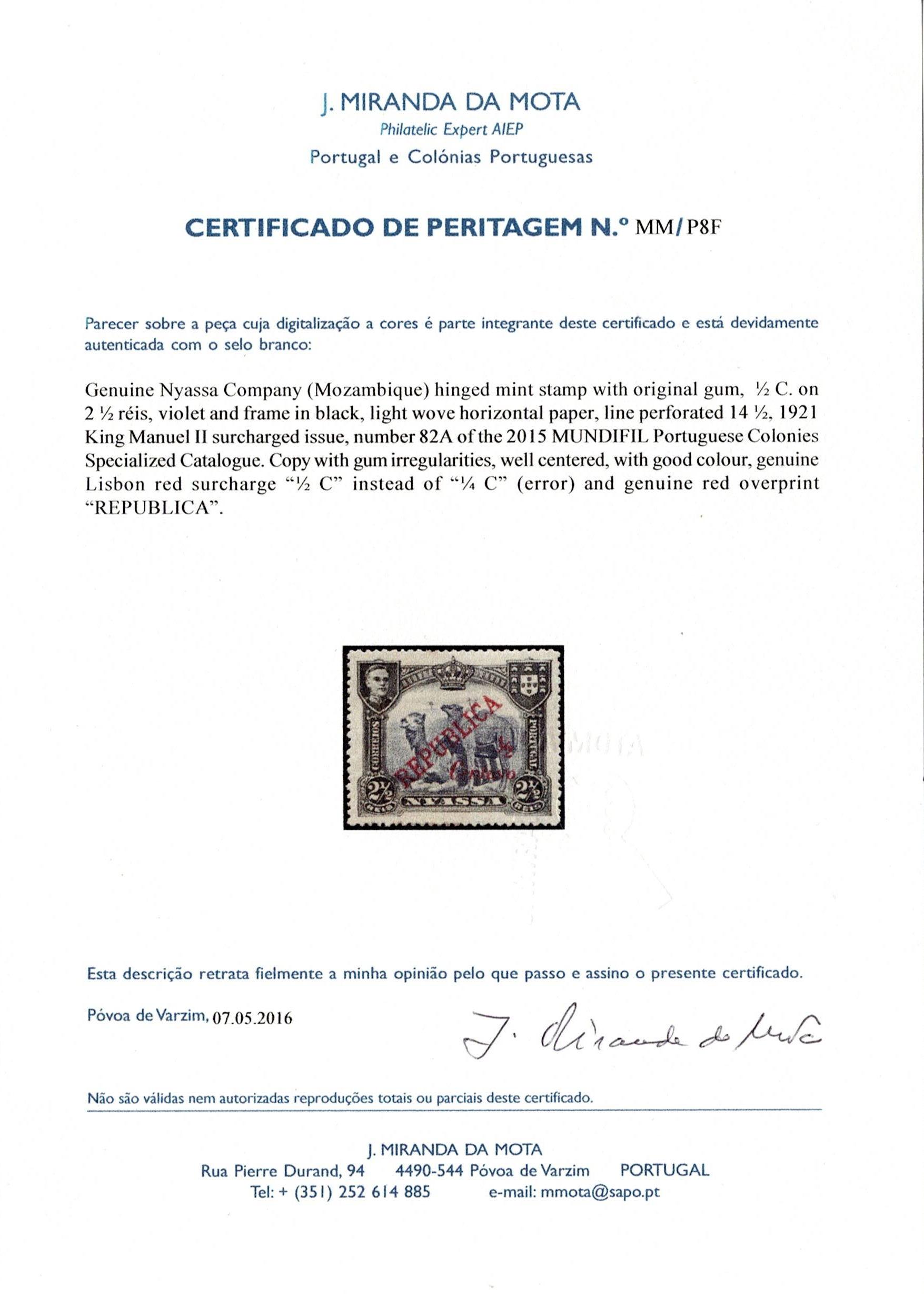 Niassa Company 1921 D. Manuel II with Republic overprint - LISBON. Stamp Mf#82A VARIETY 1/2 c. s/ 2.5