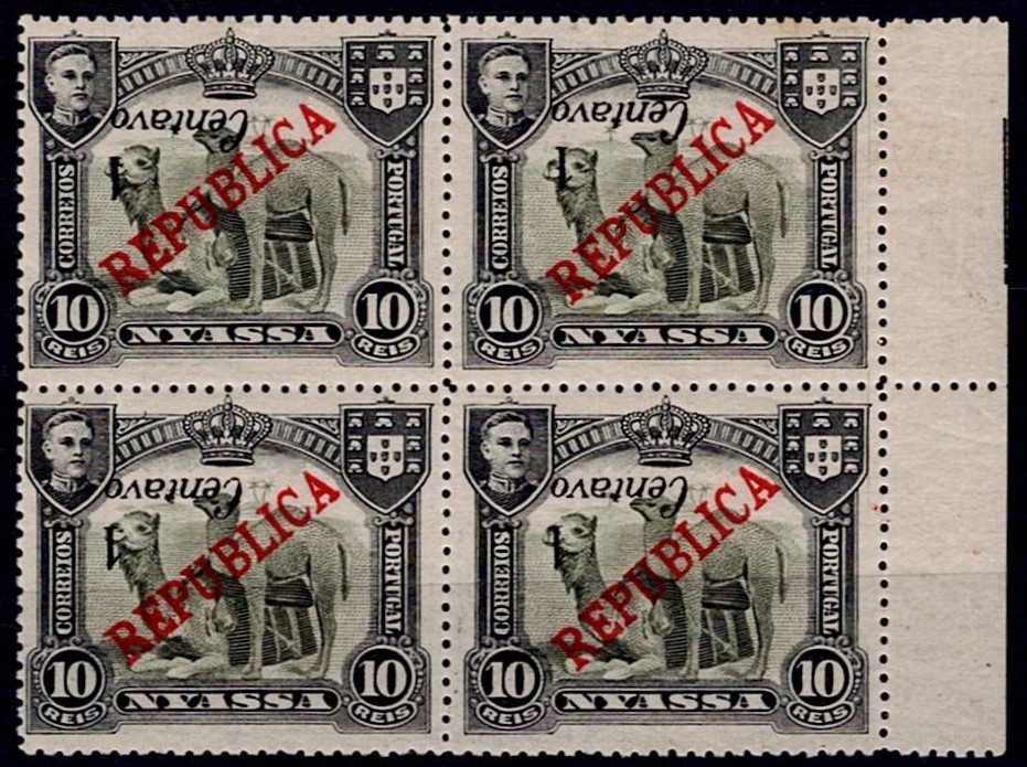 Niassa Company 1921 D. Manuel II, with inverted surcharge. QUADRA sheet edge of Mf#92a, lightly dotted