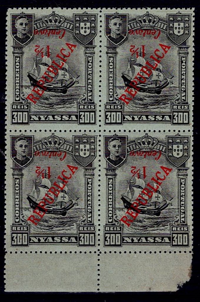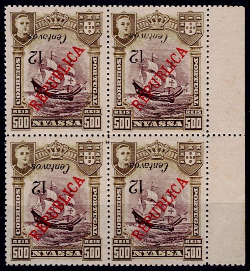 Niassa Company 1921 D. Manuel II, with inverted surcharge. QUADRA sheet edge of Mf#85a, lightly dotted