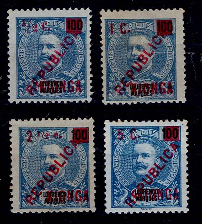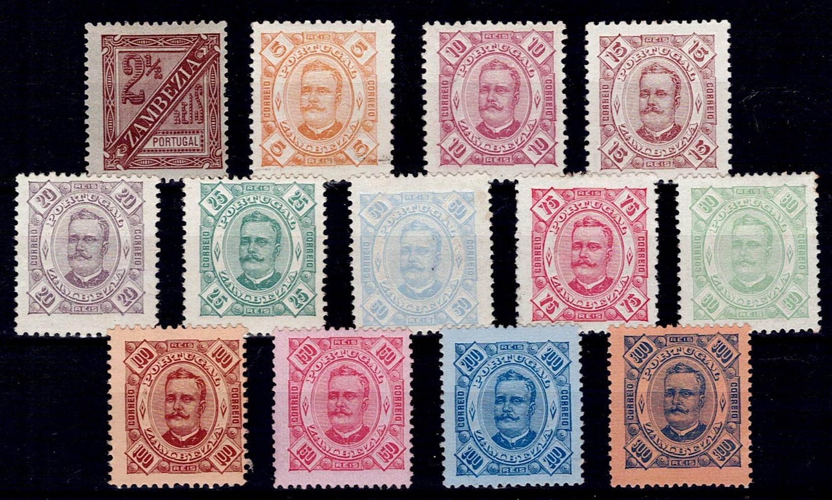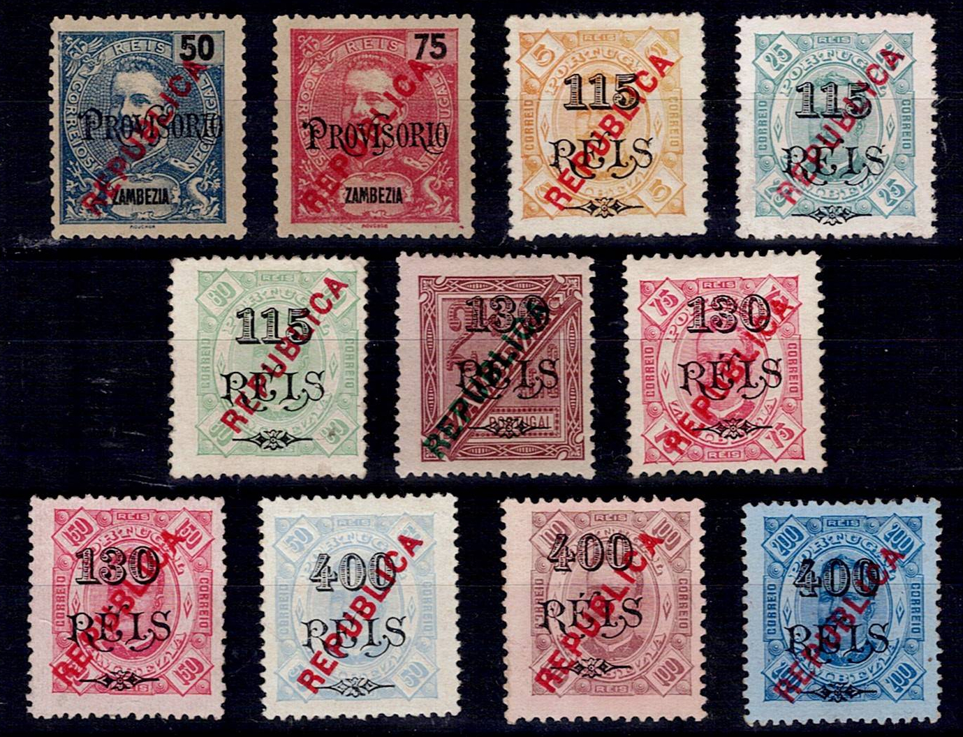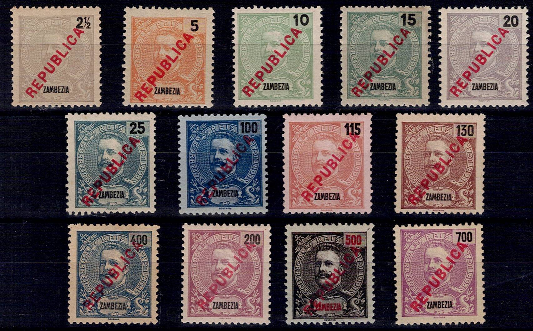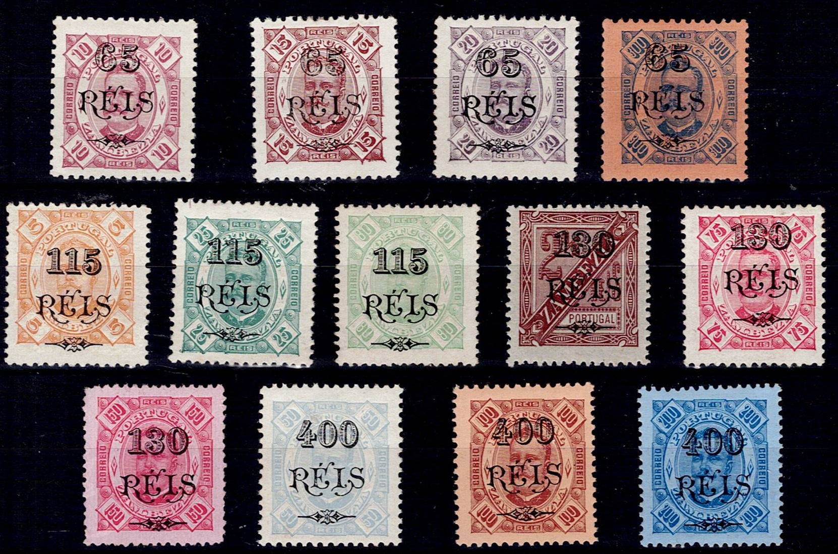 Zambézia 1903 D. Carlos I, Mouchon type, with local REPUBLICA overprint. Complete series Mf#90-102 of