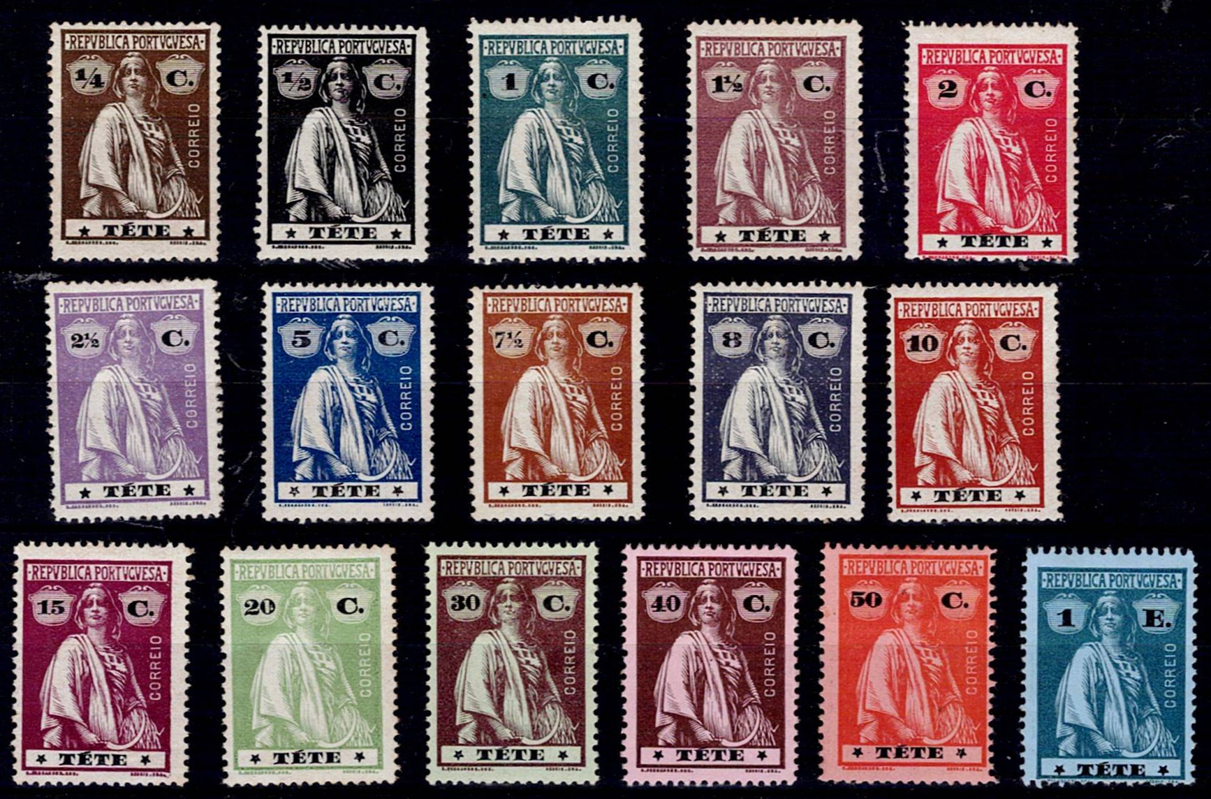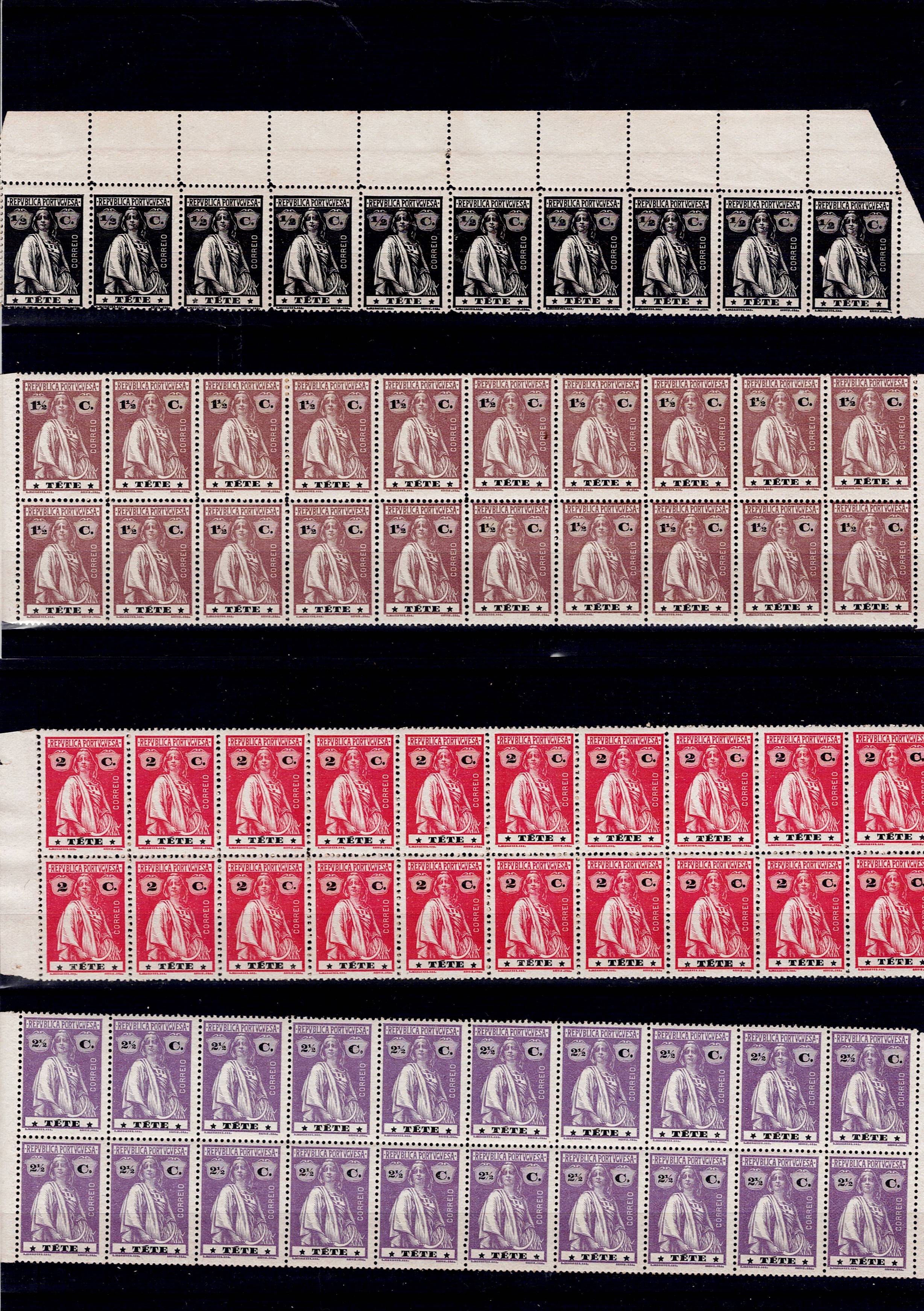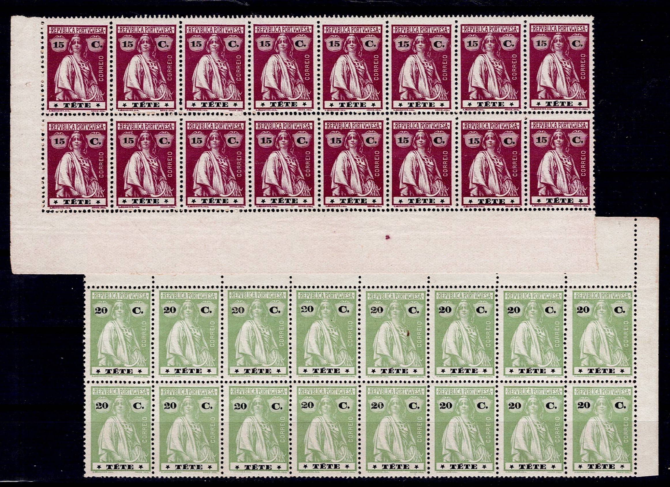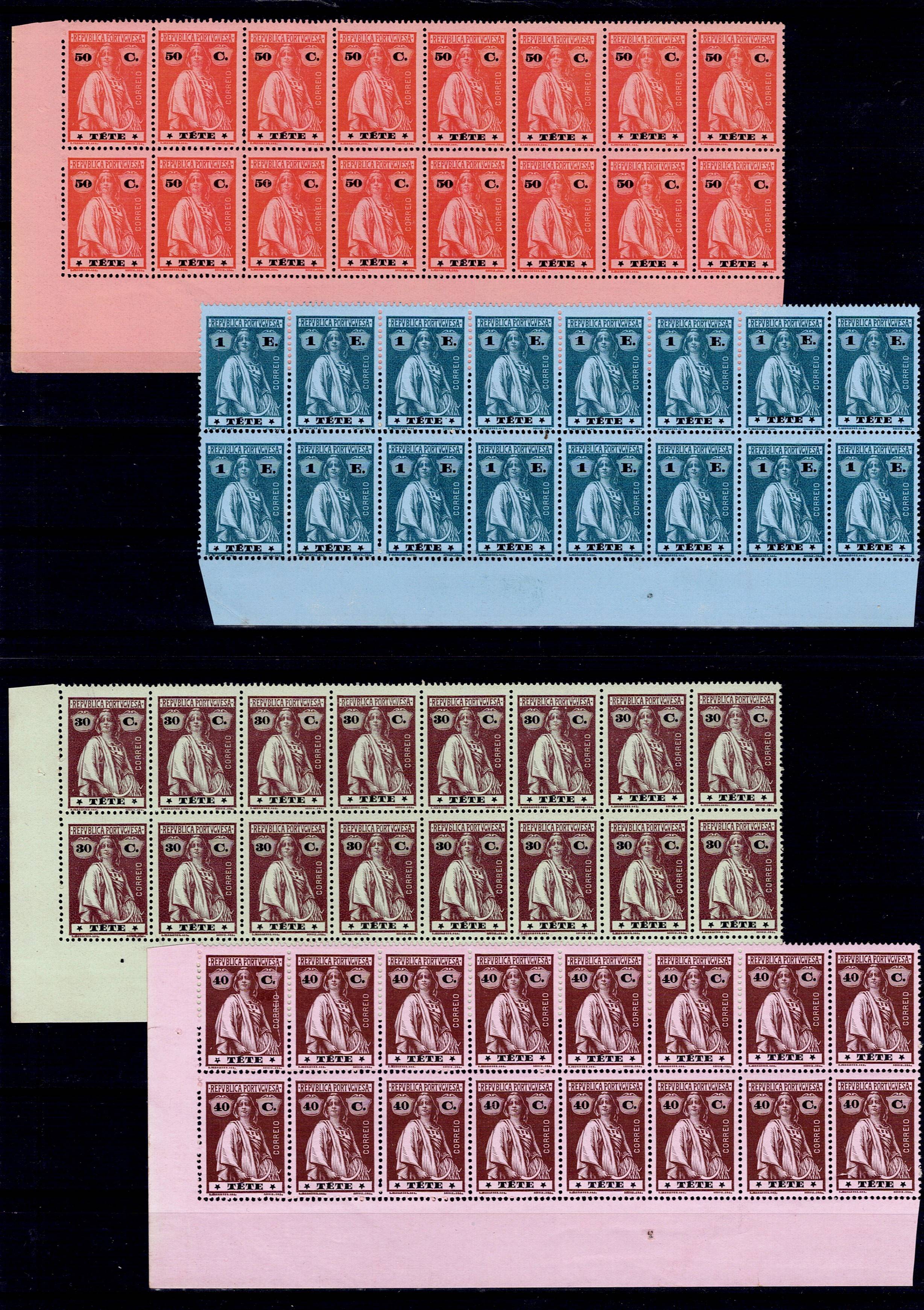 Tete 1914 Ceres. Stamp sequence Mf#35-40 inBLOCKS of 16 stamps, from 15 c lilac red to 1 esc green w/o