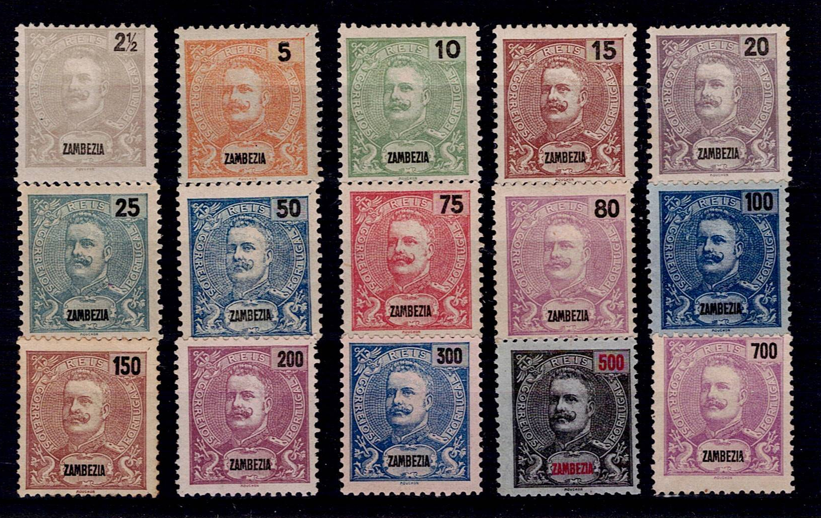 Zambézia 1898-1901 D. Carlos I Mouchon. Complete series of Mf#14-28, smooth to lightly dotted paper,