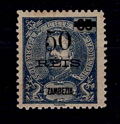 Zambézia 1905 D. Carlos, Mouchon, with surcharge. Stamp Mf#54c, 50 reis s/ 65 reis blue, smooth to