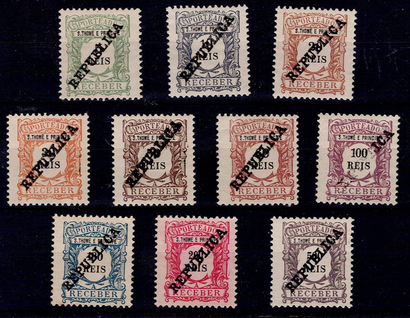 897 imageSão Tomé and Príncipe 1913 Porteado, 1904 type, with Republica zinc overprint engraved in black locally. Complete series of Mf#P31-40. New copies, gummed and hinged or ungummed as issued, with good color. Catalogue value €130.(Image 1)