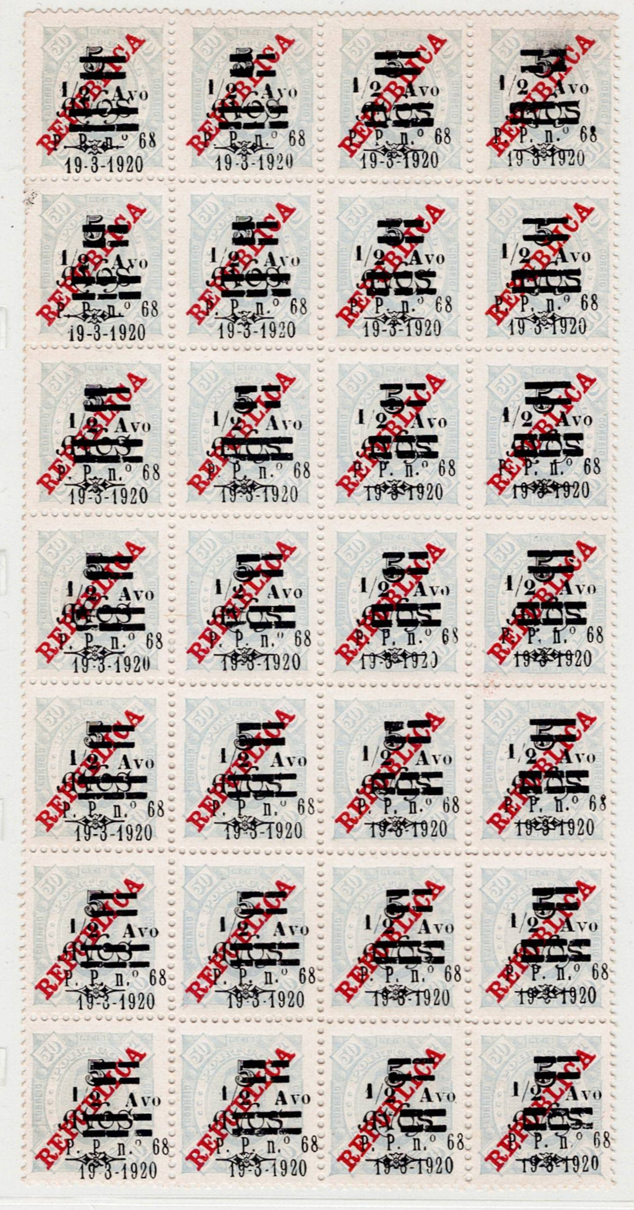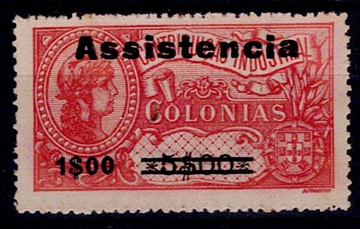 900 imageSão Tomé and Príncipe 1946 – Postal Tax. ASSISTANCE. Revenue stamps from Africa, with surcharge. MF IP7c, 1$00 without 5$00, carmine, vertically dotted paper, 15-point perforation, type II overprint, with "e" instead of "ê". New copy, ungummed as issued, with good color. Catalog value €105.(Image 1)