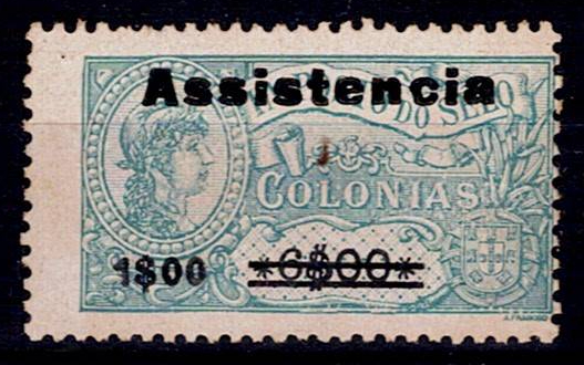 901 imageSão Tomé and Príncipe 1946 – Postal Tax. ASSISTANCE. Revenue stamps from Africa, with surcharge. MF IP8g, 1$00 without 6$00, green, vertically dotted paper, 12-point notch, type II overprint, with "e" instead of "ê". New copy, ungummed as issued, in good color. Catalog value €90.(Image 1)