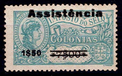 902 imageSão Tomé and Príncipe 1946 – Postal Tax. ASSISTANCE. Revenue stamps from Africa, with surcharge. Mf#IP13A, 2$50 without 7$00, green, vertically dotted paper, serration 12, type I overprint. New copy, ungummed as issued, with good color. Catalog value €190.(Image 1)