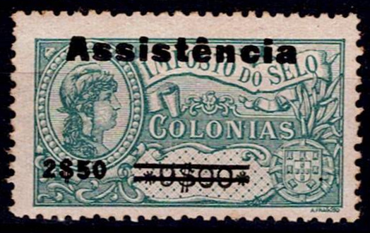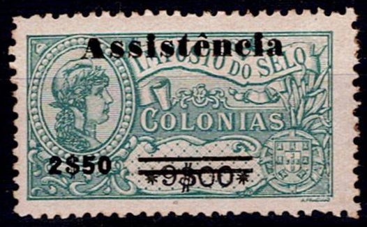 905 imageSão Tomé and Príncipe 1946 – Postal Tax. ASSISTANCE. Revenue stamps from Africa, with surcharge. Mf#IP15b, 2$50 without 9$00, green, vertically dotted paper, 12-point notch, type II overprint. New copy, ungummed as issued, with good color. Catalog value €130.(Image 1)