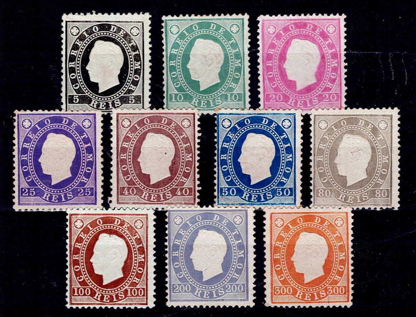 907 imageTimor 1888 D. Luis right ribbon. Complete series of stamps Mf#11-20, porcelain paper and perforation 12 3/4. New stamps, ungummed, with good color and relief. Catalog value 240+.(Image 1)