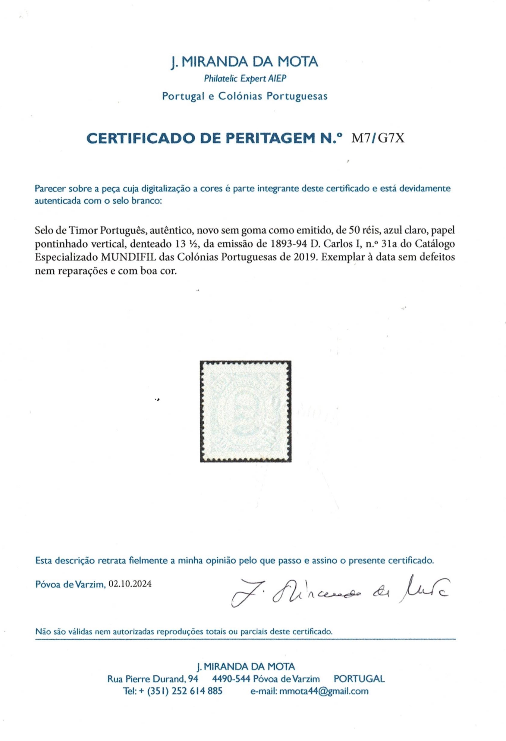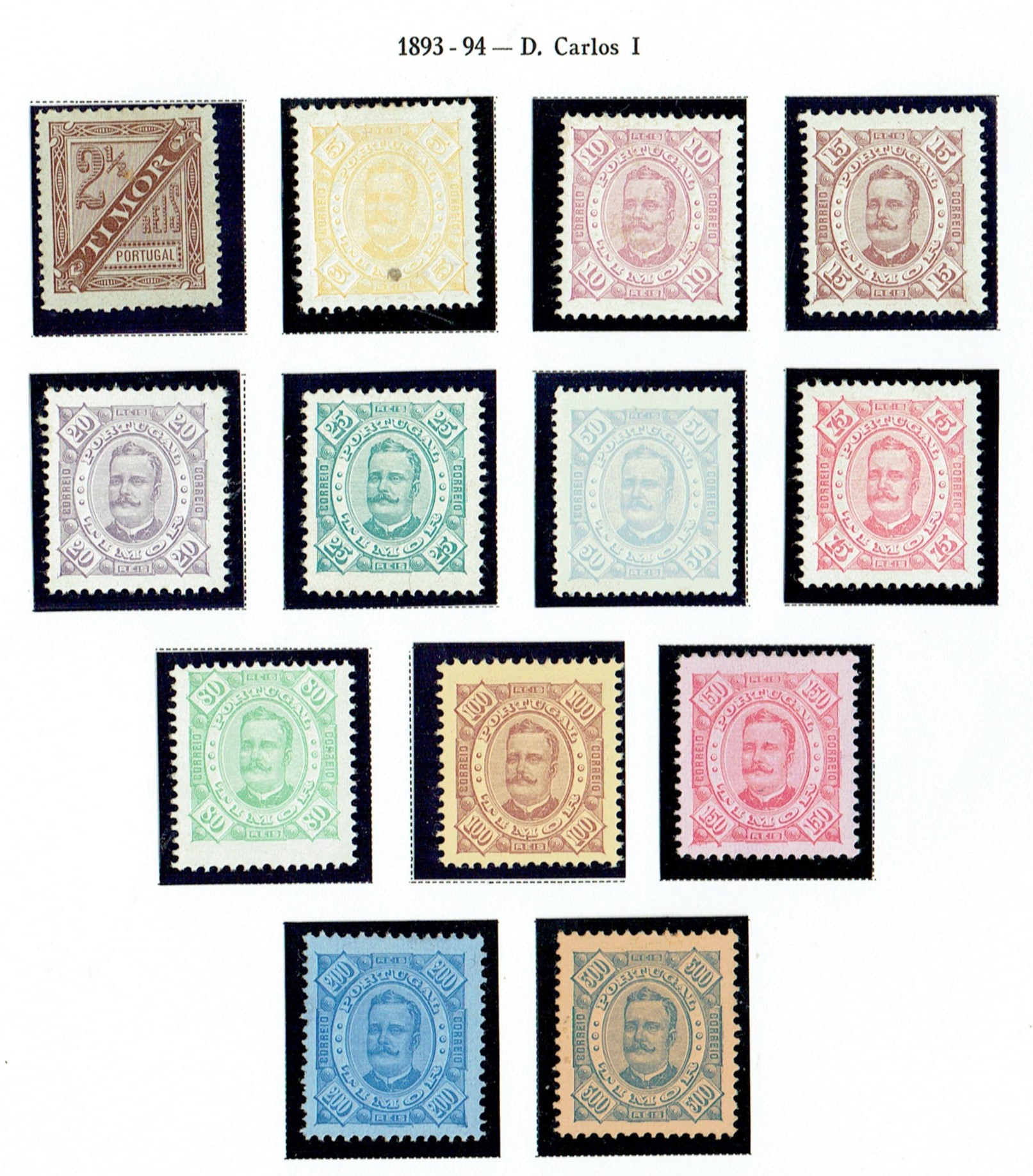 908 imageTimor 1893-94 D. Carlos, Diogo Neto. Complete series of stamps Mf#26-37 porcelain and 11 3/4 toothed paper, but with the 50 reis stamp on DOTTED paper, 13.5 toothed. Series composed of new stamps without gum as issued, the 50 reis being without defects or repairs, and with good color. Comes with a certificate from J. Miranda da Mota. Catalog value €993.(Image 1) (Image 2) (Image 3)