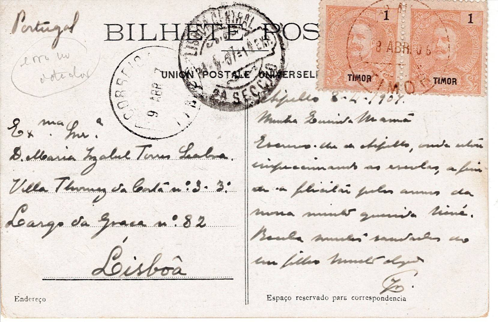 909 imageTimor. Illustrated postcard from the Dilli Customs, postage of 2 avos, issued on 8 April 1906 (error in the date stamp) from AIPELLO, via Dilly, 9.4 to Lisbon 1.5(Image 1) (Image 2)