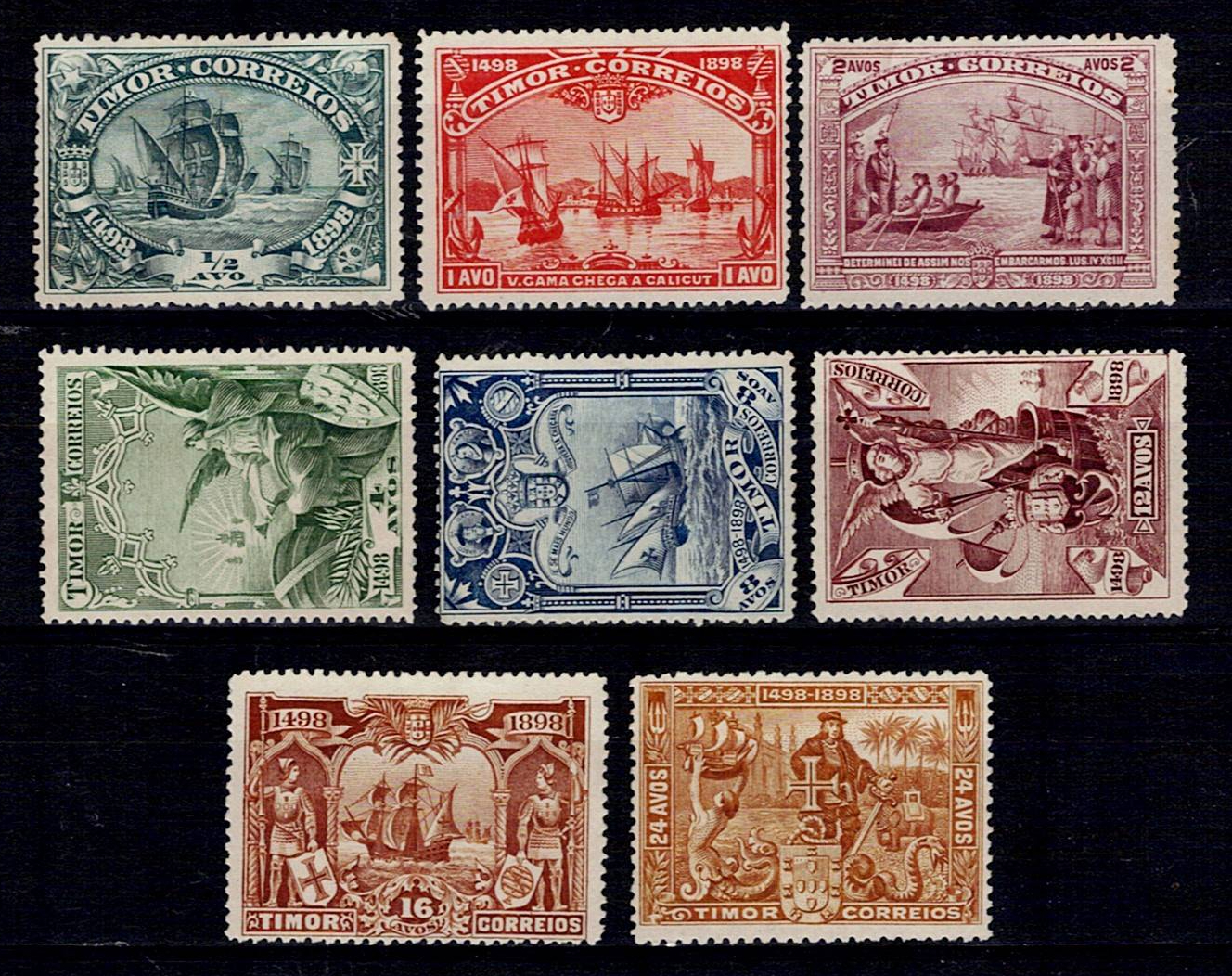 910 imageTimor 1898 – 4th Centenary of the Discovery of the Sea Route to India. Complete series of Mf#50-57, light dotted paper. New copies, ungummed, unrepaired, with good color. Catalogue value €55.(Image 1)