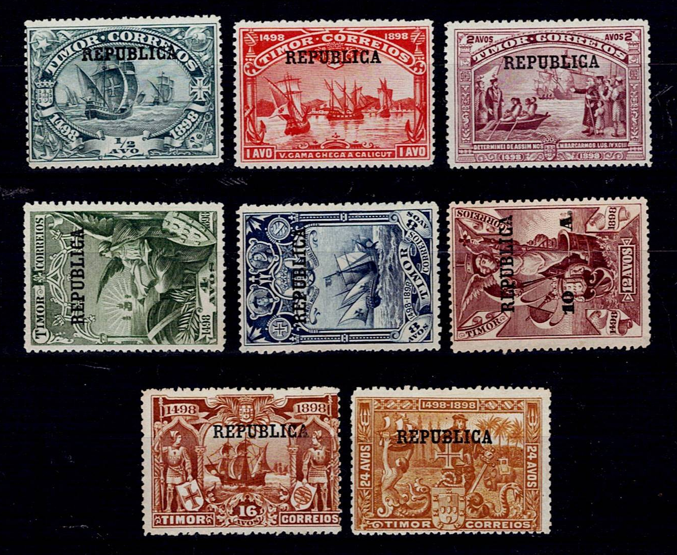 911 imageTimor 1913 – 4th Centenary of the Discovery of the Sea Route to India, with Republic overprint. Complete series of Mf#126-133, light dotted paper. Ungummed copies, without defects or repairs, with good color. Catalog value €24.(Image 1)