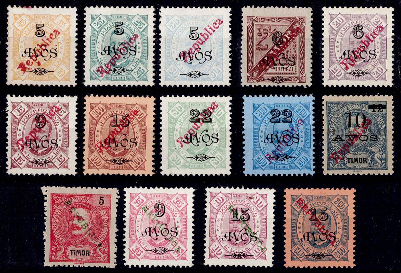 912 imageTimor 1913 D. Carlos with local REPUBLIC overprint. Stamp series Mf#135-148 in new, ungummed, good color. Catalog value €134.(Image 1)