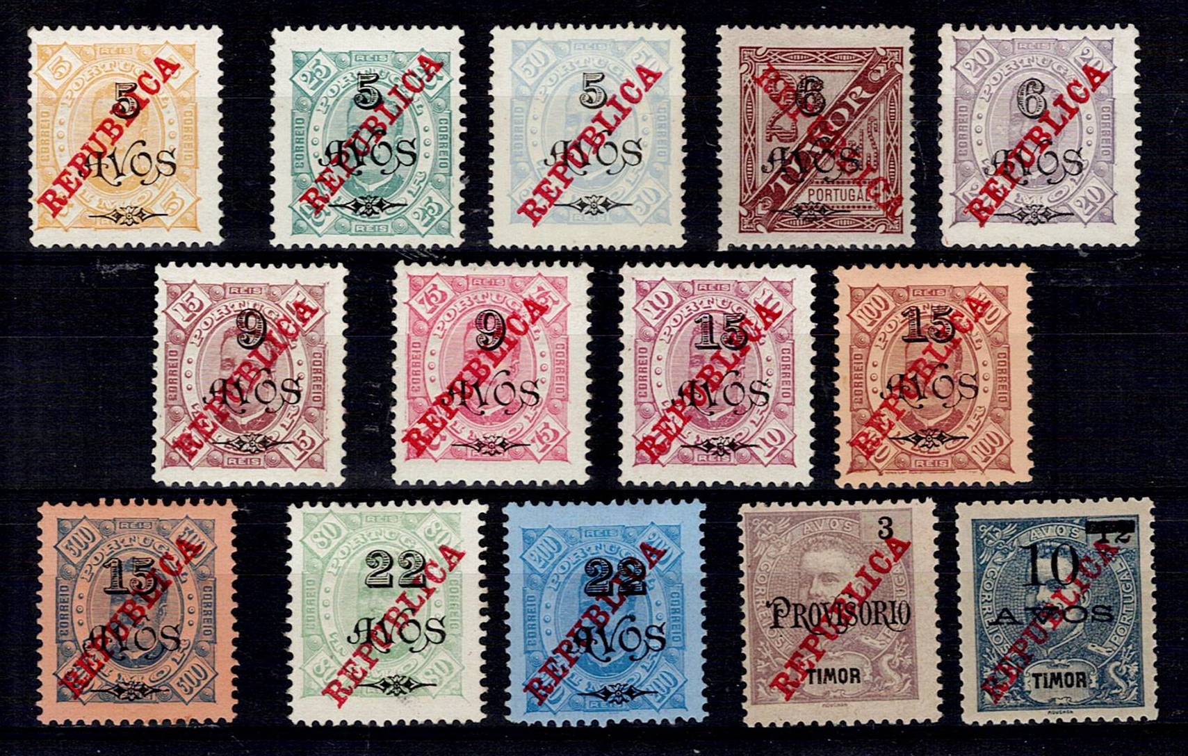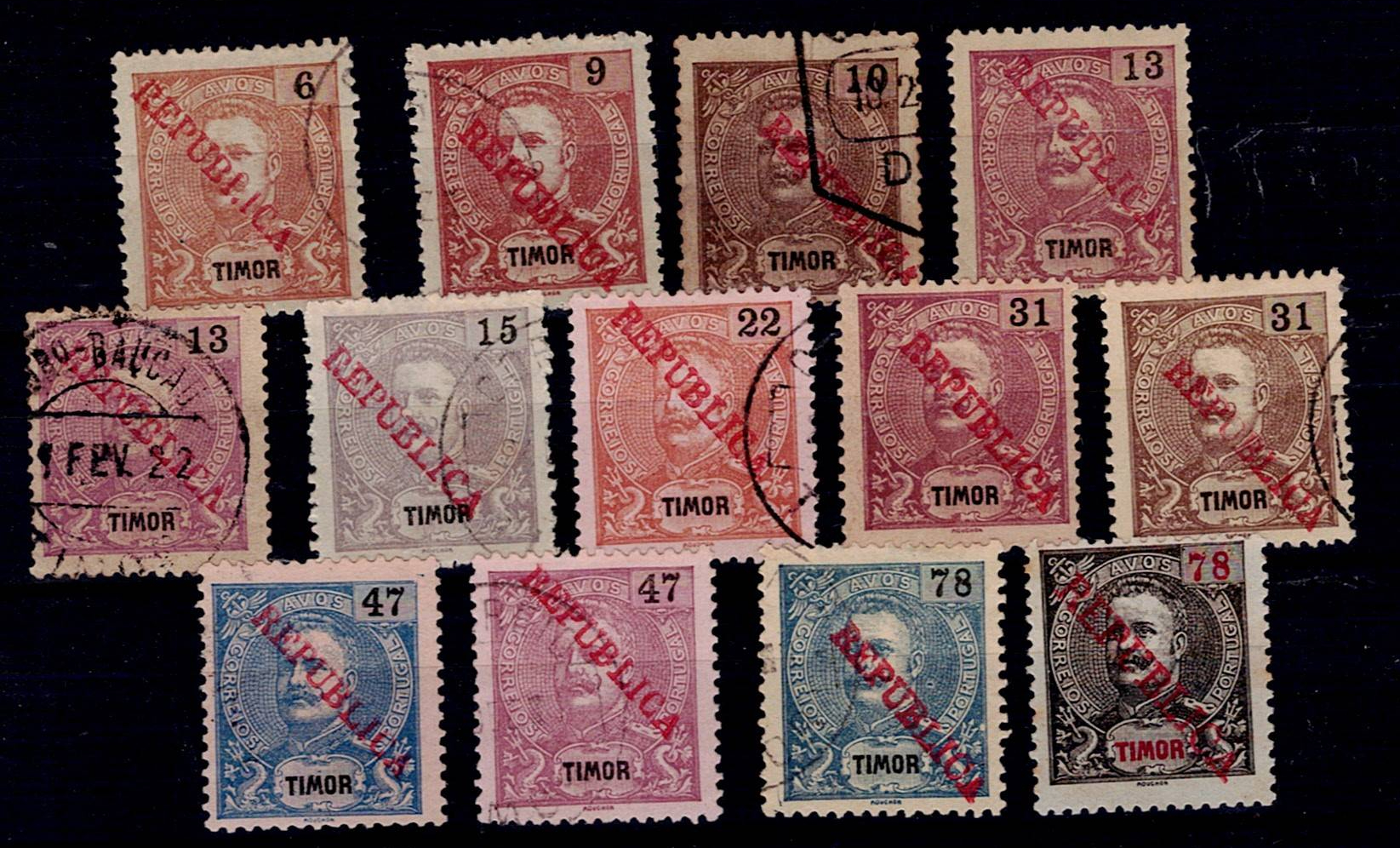 913 imageTimor 1913 D. Carlos Mouchon type, with local REPUBLICA overprint. Complete series of stamps Mf#149-160, smooth, light dotted paper, 11 3/4 notch. Used copies (with 3 exceptions, new without gum), with good color. Catalog value €172+.(Image 1)