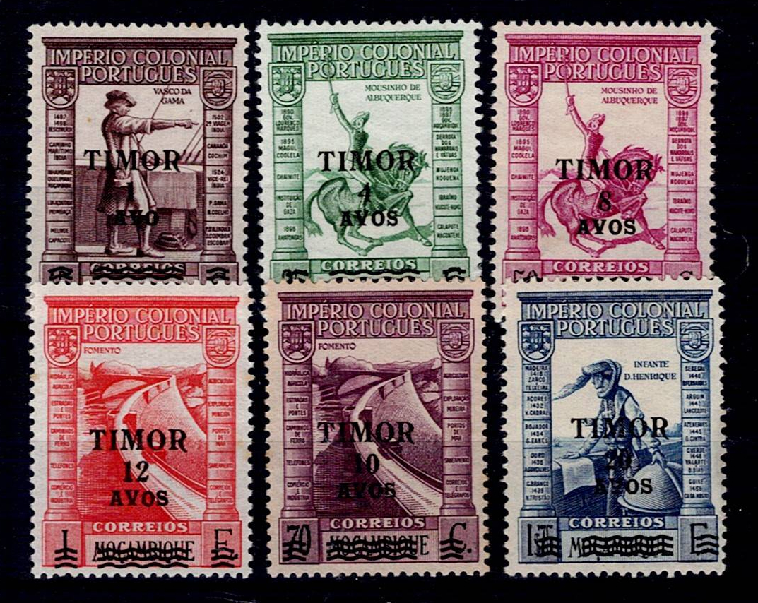 917 imageTimor 1946 Portuguese Colonial Empire of Mozambique with surcharge. Complete series of Mf#244-249, smooth paper, 13 1/2 perforation. New copies, ungummed, unrepaired, with good color. Catalog value €66.(Image 1)