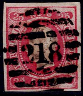serrated. Mf#22, 25 réis, pink carmine, smooth paper, not serrated. Used copy, with 4 very short margins, in good color and relief, without defects or repairs, obliterated with a black stamp “218 – TAVIRA”, Algarve.(Image 1)