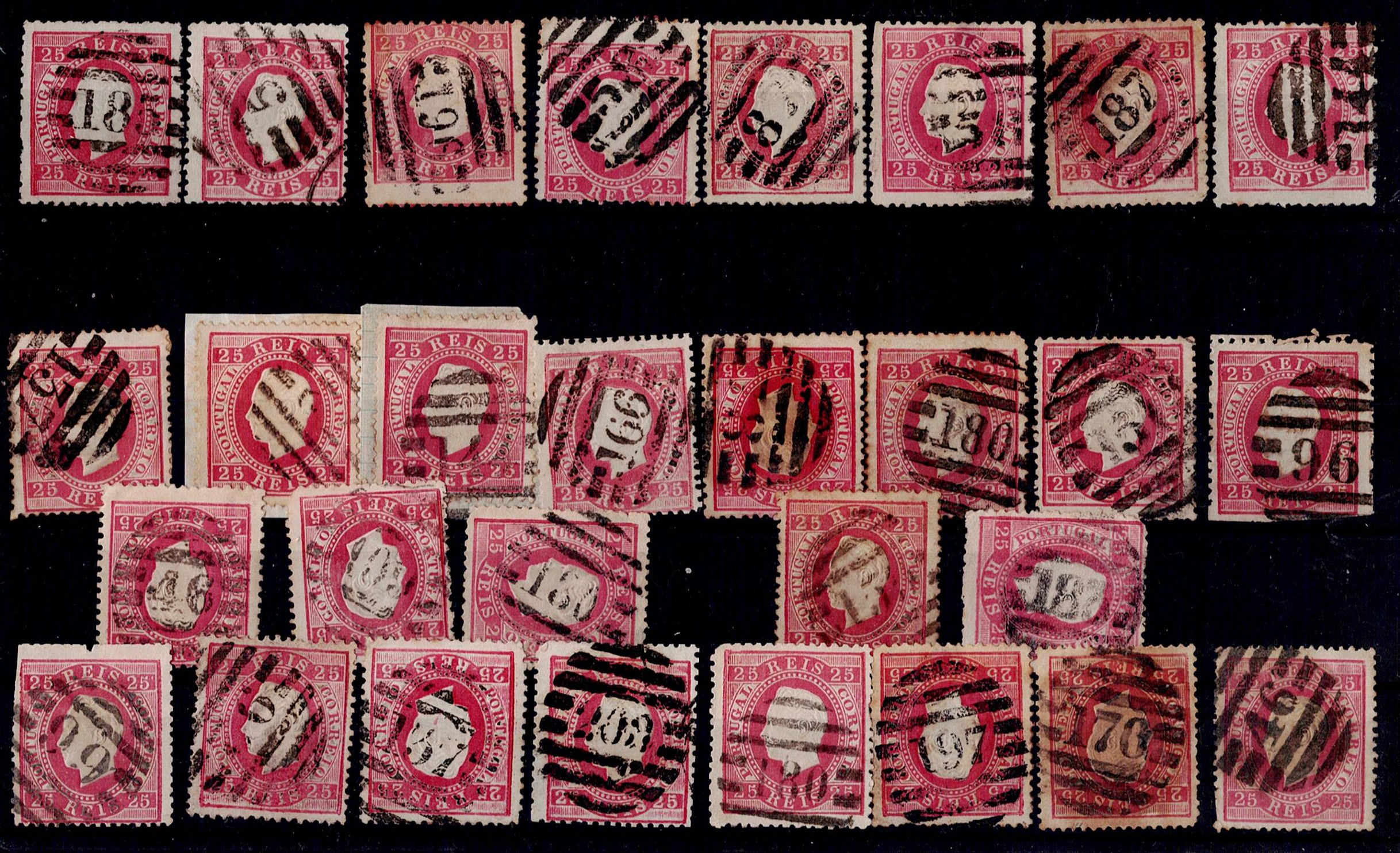 Marcofilia Portugal 2nd postal reform. Set of 29 stamps of 25 kings D. Luis right ribbon, 3/2/3 bar
