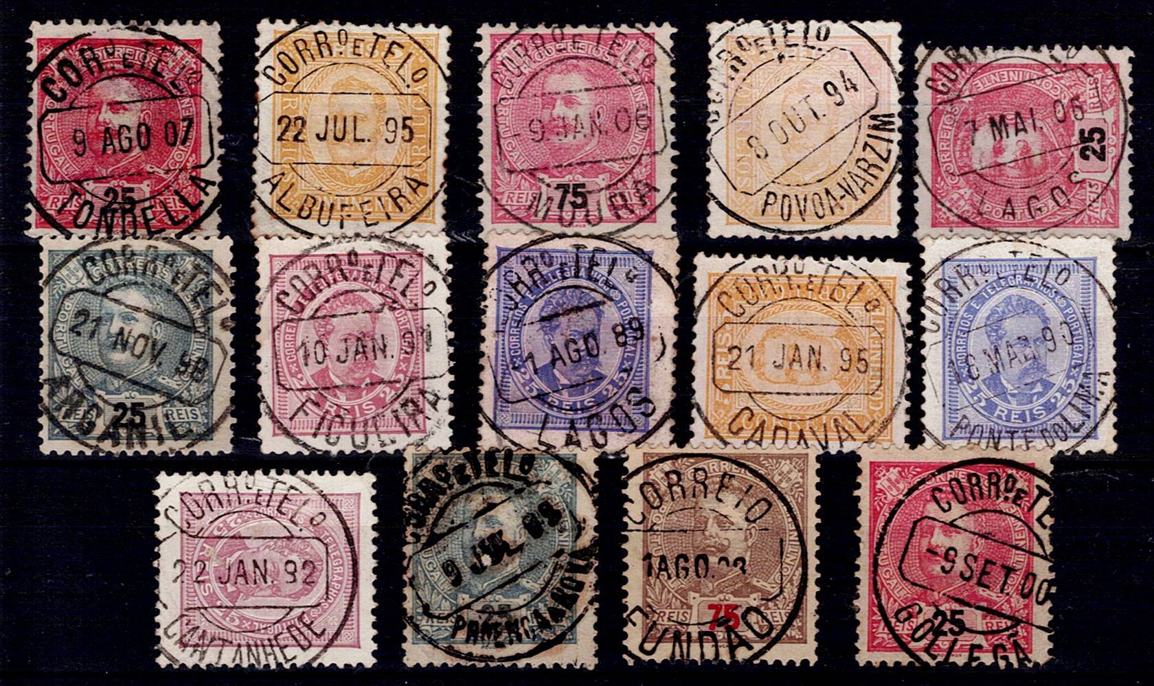 Marcofilia Portugal, dated circular postmarks. 14 stamps by D. Carlos, Mouchon, and Diogo Neto, with