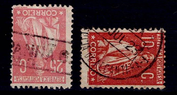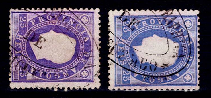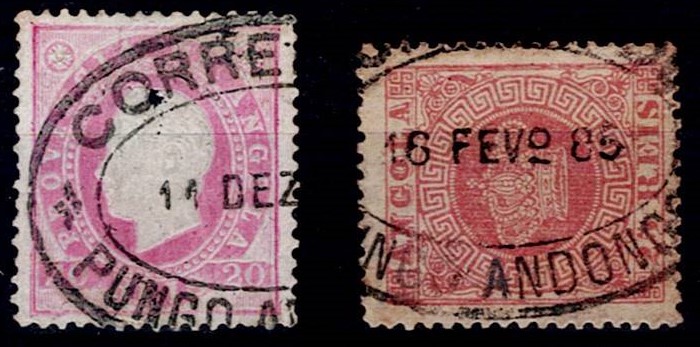 Marcofilia Angola double oval stamps. Set of 2 stamps Crown 25 reis pink and D. Luis 20 reis pink with