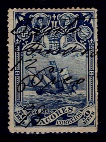 Marcofilia Azores. Handwritten wordmarks. 50 reis Centenary of India stamp from the Azores with