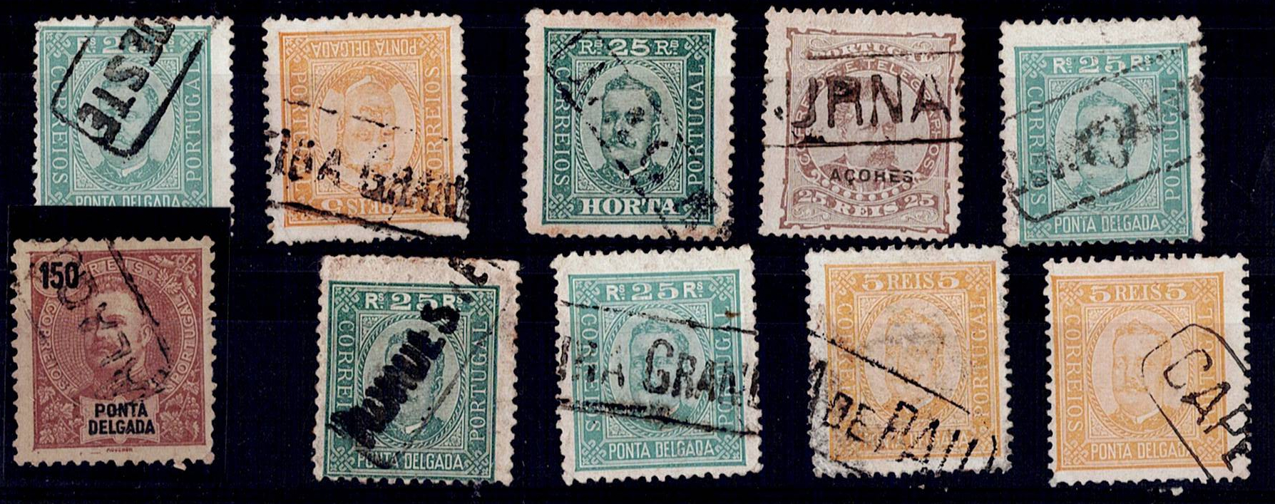 Marcophilia Azores. Wordmarks. Lot of 10 stamps, with wordmarks, AGUA DE PAU; CAPELAS; NORDESTE;