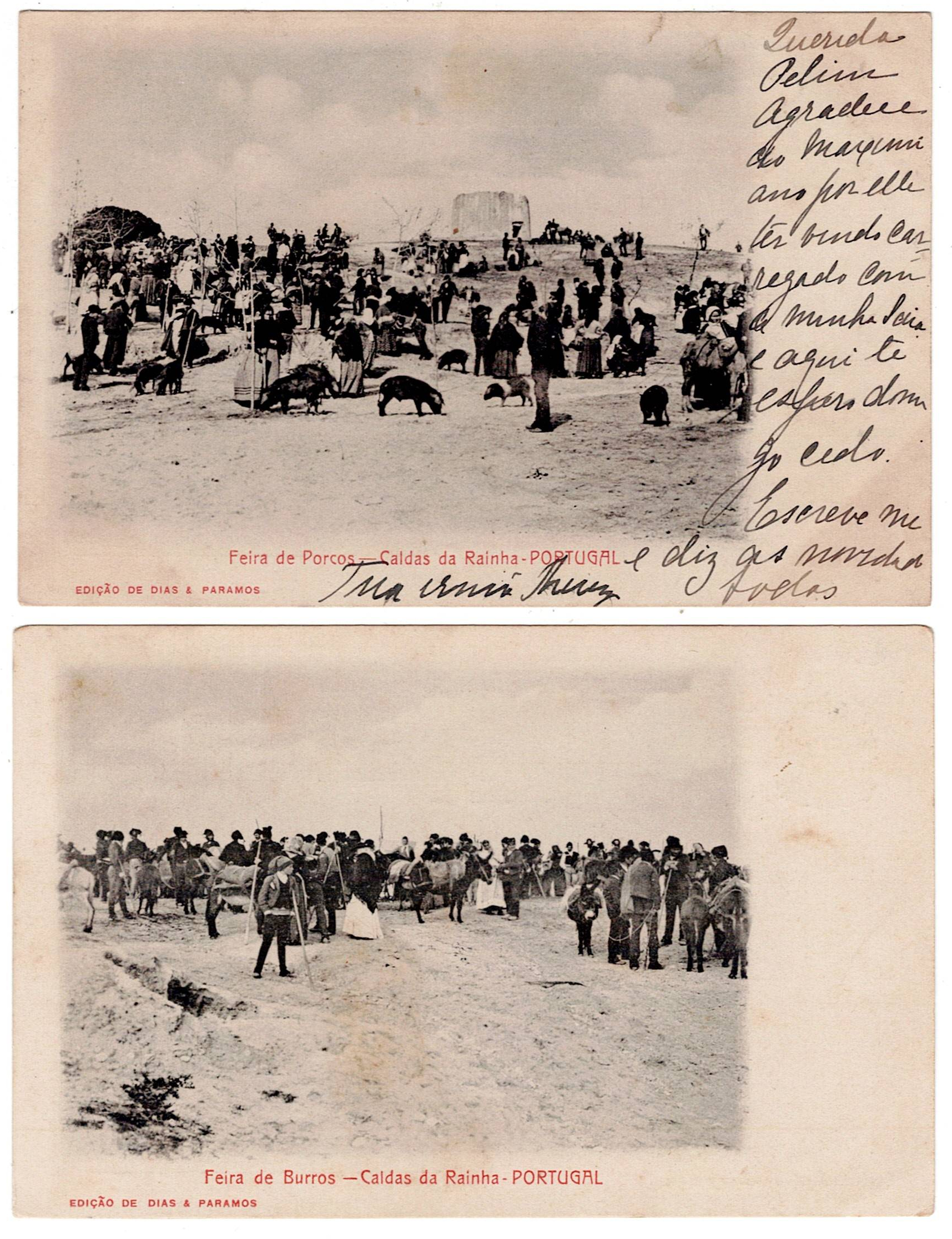 Postcards Portugal Caldas da Rainha. Monochrome postcard (2) of the Pig Fair and Donkey Fair in Caldas.