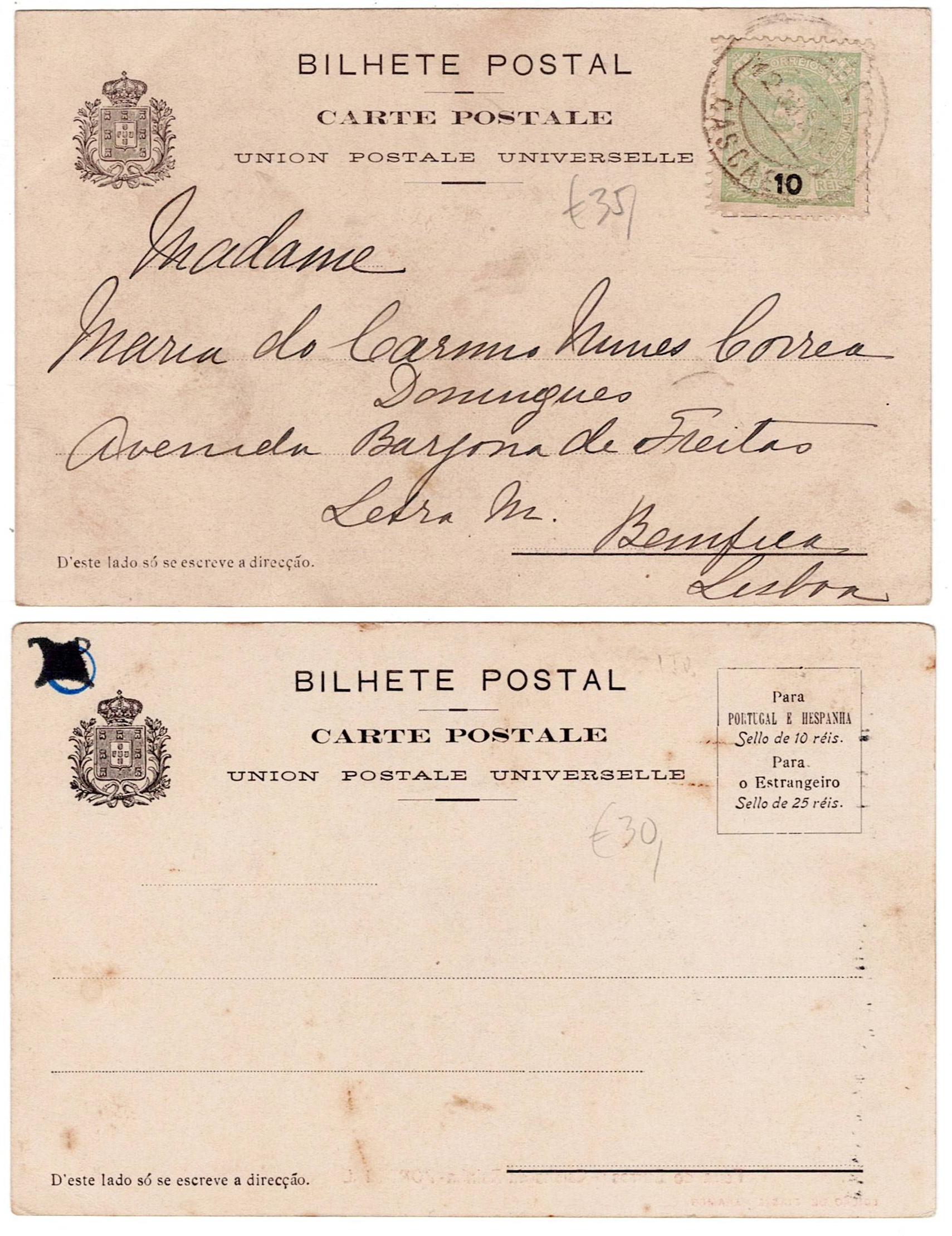 Dias e Paramos edition, one new and one circulated for Cascais with 10 reis D. Carlos Mouchon stamp, minor defects.(Image 1)